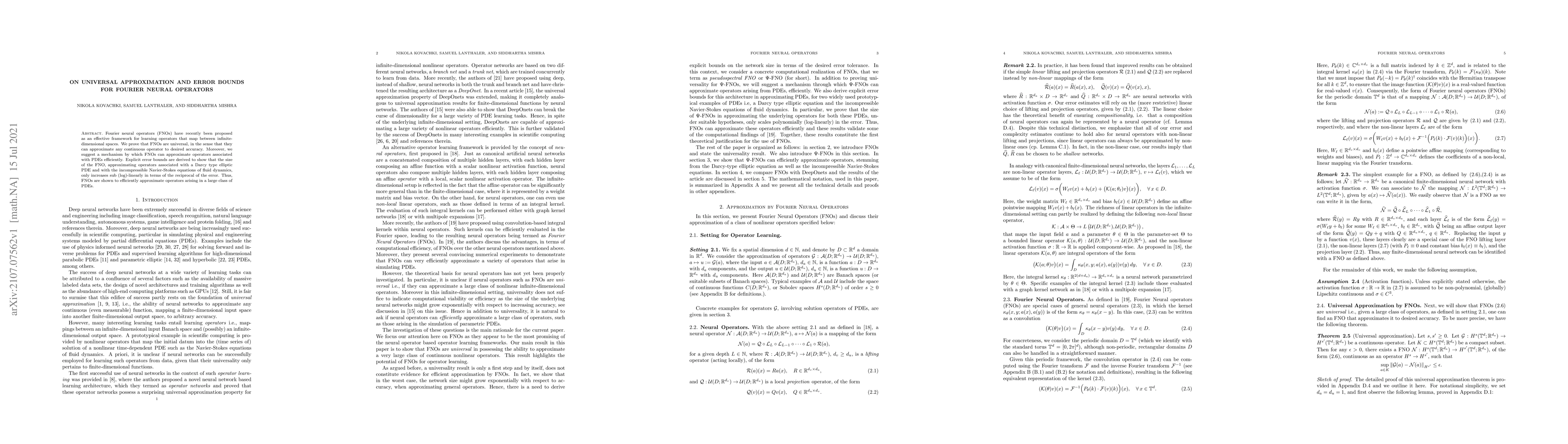 This paper proves that Fourier Neural Operators (FNOs) are universal approximators for continuous operators and introduces efficient mechanisms for approximating operators linked to PDEs, including Darcy type elliptic PDEs and incompressible Navier-Stokes equations. Error bounds demonstrate that FNOs require only sub (log)-linear growth in size relative to error reduction, indicating efficient approximation for a wide range of PDEs.
