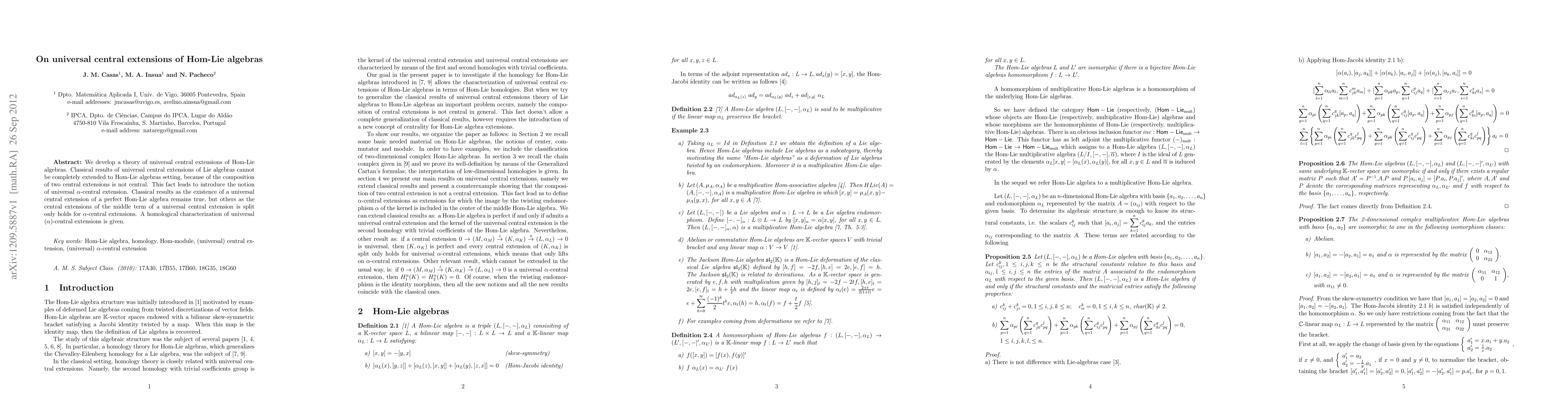This paper develops a theory for universal central extensions of Hom-Lie algebras, introducing the concept of universal $\alpha$-central extensions due to the non-centrality of composition of central extensions. It affirms the existence of a universal central extension for perfect Hom-Lie algebras but notes that middle term central extensions are split only for $\alpha$-central extensions, with a homological characterization provided.