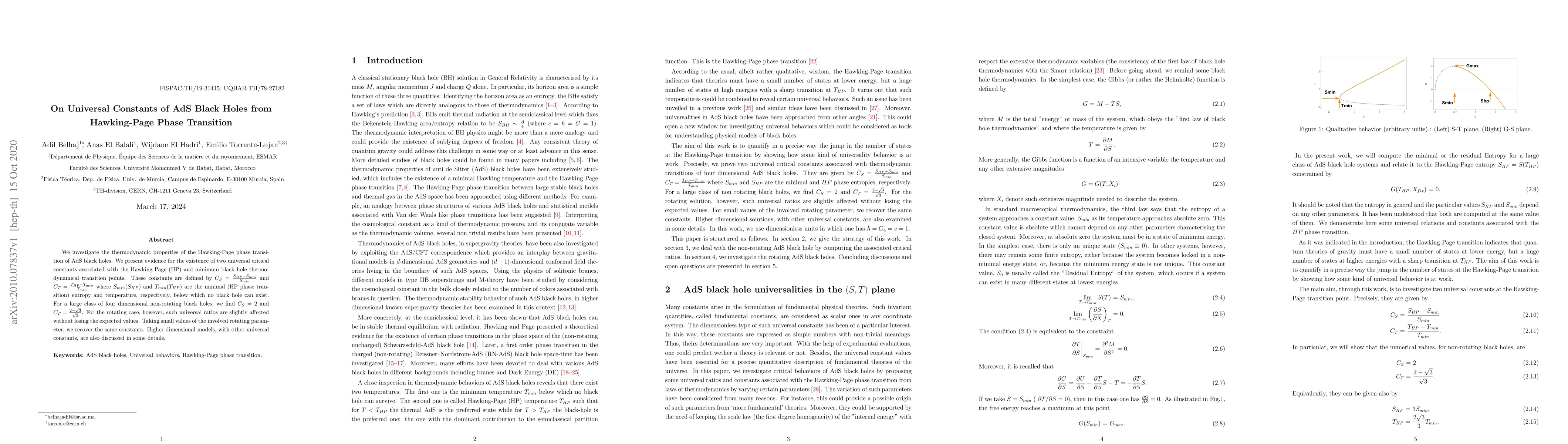 We investigate the thermodynamic properties of the Hawking-Page phase transition of AdS black holes. We present evidence for the existence of two universal critical constants associated with the Hawking-Page (HP) and minimum black hole thermodynamical transition points. These constants are defined by C_S =\frac{S_{HP}-S_{min}}{S_{min}} and C_T =\frac{T_{HP}-T_{min}}{T_{min}} where S_{min}(S_{HP}) and T_{min}(T_{HP}) are the minimal (HP phase transition) entropy and temperature, respectively, below which no black hole can exist. For a large class of four dimensional non-rotating black holes, we find C_S =2 and C_T = \frac{2-\sqrt{3}}{\sqrt{3}}. For the rotating case, however, such universal ratios are slightly affected without losing the expected values. Taking small values of the involved rotating parameter, we recover the same constants. Higher dimensional models, with other universal constants, are also discussed in some details.