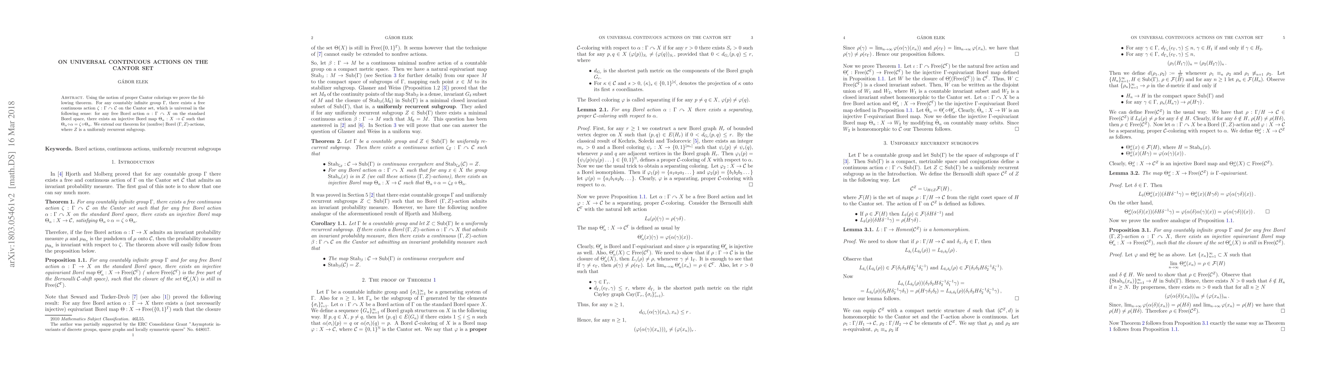 This paper demonstrates the existence of a universal continuous action on the Cantor set for any countably infinite group, showing that any free Borel action can be embedded into this action via an injective Borel map. It also extends this result to nonfree Borel actions involving uniformly recurrent subgroups.