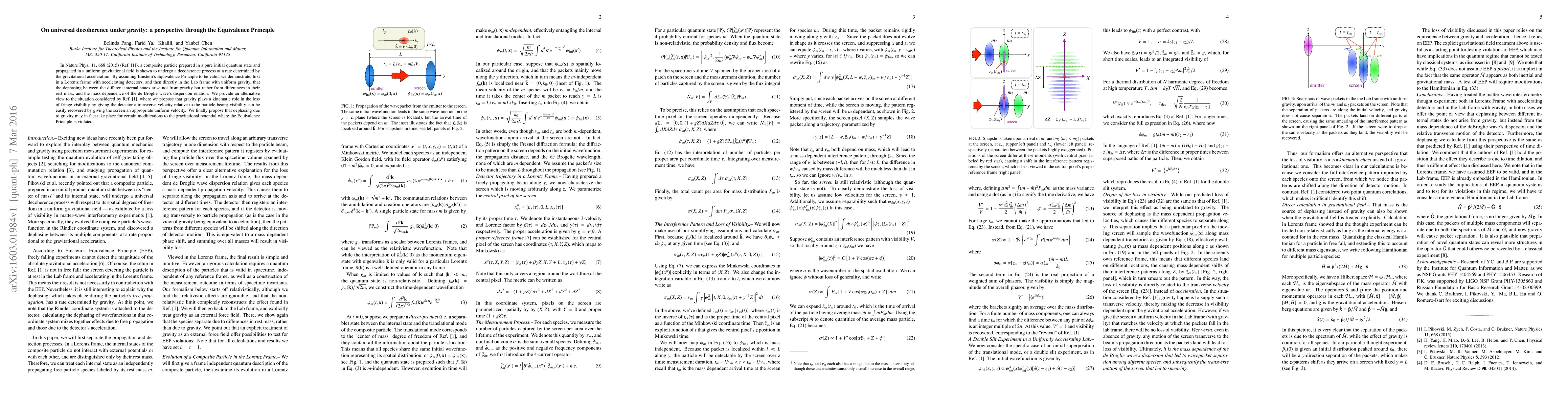 In Nature Phys. 11, 668 (2015) (Ref. [1]), a composite particle prepared in a pure initial quantum state and propagated in a uniform gravitational field is shown to undergo a decoherence process at a rate determined by the gravitational acceleration. By assuming Einstein's Equivalence Principle to be valid, we demonstrate, first in a Lorentz frame with accelerating detectors, and then directly in the Lab frame with uniform gravity, that the dephasing between the different internal states arise not from gravity but rather from differences in their rest mass, and the mass dependence of the de Broglie wave's dispersion relation. We provide an alternative view to the situation considered by Ref. [1], where we propose that gravity plays a kinematic role in the loss of fringe visibility by giving the detector a transverse velocity relative to the particle beam; visibility can be easily recovered by giving the screen an appropriate uniform velocity. We finally propose that dephasing due to gravity may in fact take place for certain modifications to the gravitational potential where the Equivalence Principle is violated.