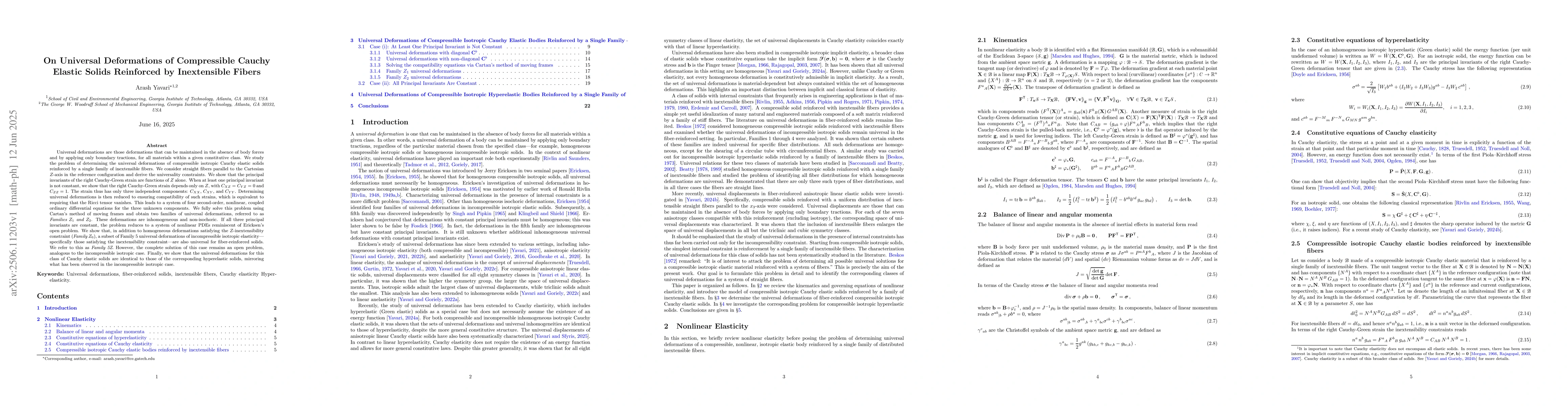 Universal deformations are those that can be maintained in the absence of body forces and by applying only boundary tractions, for all materials within a given constitutive class. We study the universal deformations of compressible isotropic Cauchy elastic solids reinforced by a single family of inextensible fibers. We consider straight fibers parallel to the Cartesian Z-axis in the reference configuration and derive the universality constraints. The principal invariants of the right Cauchy-Green strain are functions of Z alone. When at least one principal invariant is not constant, the strain depends only on Z, with $C_{XZ} = C_{YZ} = 0$ and $C_{ZZ} = 1$, leaving three independent components: $C_{XX}$, $C_{XY}$, and $C_{YY}$. Determining universal deformations then reduces to ensuring compatibility, which is equivalent to requiring that the Ricci tensor vanishes. This yields a system of four second-order, nonlinear, coupled ordinary differential equations for the three unknown components. We fully solve this problem using Cartan's method of moving frames and obtain two families of universal deformations, referred to as Families Z1 and Z2, which are inhomogeneous and non-isochoric. If all three principal invariants are constant, the problem reduces to a system of nonlinear PDEs reminiscent of Ericksen's open problem. In addition to homogeneous deformations satisfying the Z-inextensibility constraint (Family Z0), a subset of Family 5 universal deformations of incompressible isotropic elasticity -- specifically those satisfying the inextensibility constraint -- are also universal for fiber-reinforced solids (Family 5Z). The complete solution of this case remains open. Finally, we show that the universal deformations for this class of Cauchy elastic solids are identical to those of the corresponding hyperelastic solids.