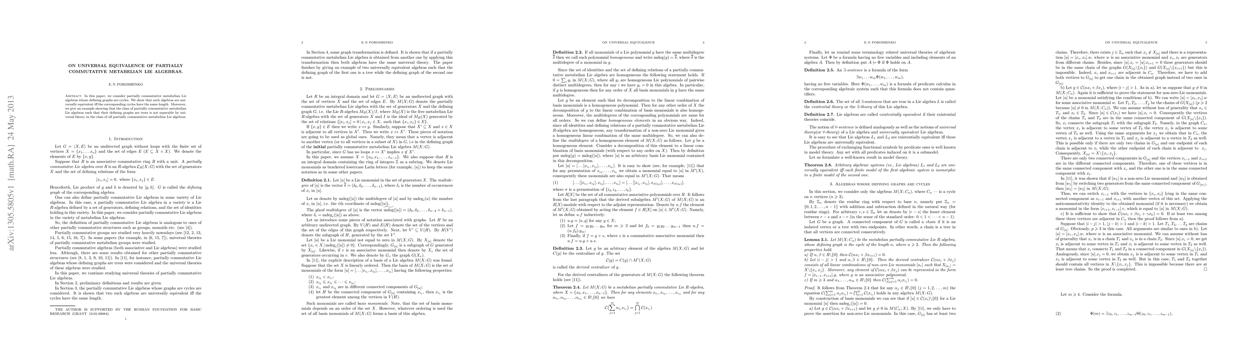 This paper demonstrates that partially commutative metabelian Lie algebras with cyclic defining graphs are universally equivalent if and only if their cycles have the same length. It also provides an example showing that partially commutative metabelian Lie algebras with tree defining graphs cannot be distinguished by universal theory in the broader class of such algebras.