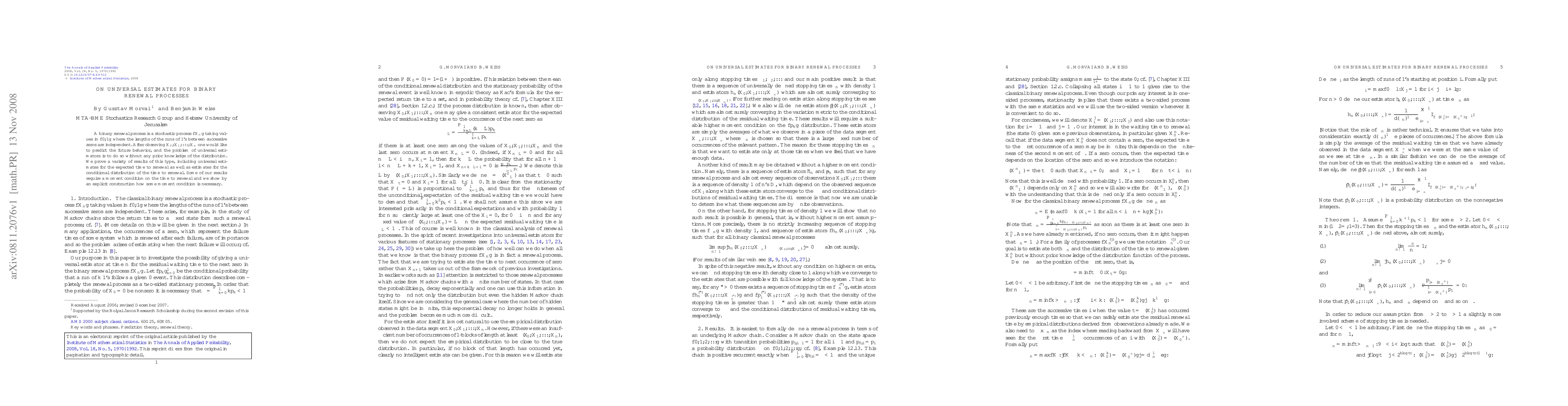 A binary renewal process is a stochastic process $\{X_n\}$ taking values in $\{0,1\}$ where the lengths of the runs of 1's between successive zeros are independent. After observing ${X_0,X_1,...,X_n}$ one would like to predict the future behavior, and the problem of universal estimators is to do so without any prior knowledge of the distribution. We prove a variety of results of this type, including universal estimates for the expected time to renewal as well as estimates for the conditional distribution of the time to renewal. Some of our results require a moment condition on the time to renewal and we show by an explicit construction how some moment condition is necessary.