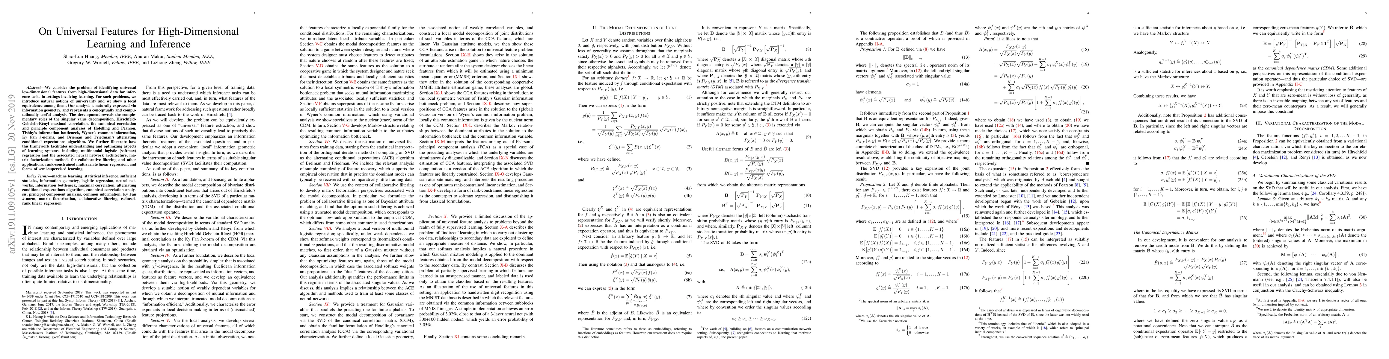 We consider the problem of identifying universal low-dimensional features from high-dimensional data for inference tasks in settings involving learning. For such problems, we introduce natural notions of universality and we show a local equivalence among them. Our analysis is naturally expressed via information geometry, and represents a conceptually and computationally useful analysis. The development reveals the complementary roles of the singular value decomposition, Hirschfeld-Gebelein-R\'enyi maximal correlation, the canonical correlation and principle component analyses of Hotelling and Pearson, Tishby's information bottleneck, Wyner's common information, Ky Fan $k$-norms, and Brieman and Friedman's alternating conditional expectations algorithm. We further illustrate how this framework facilitates understanding and optimizing aspects of learning systems, including multinomial logistic (softmax) regression and the associated neural network architecture, matrix factorization methods for collaborative filtering and other applications, rank-constrained multivariate linear regression, and forms of semi-supervised learning.