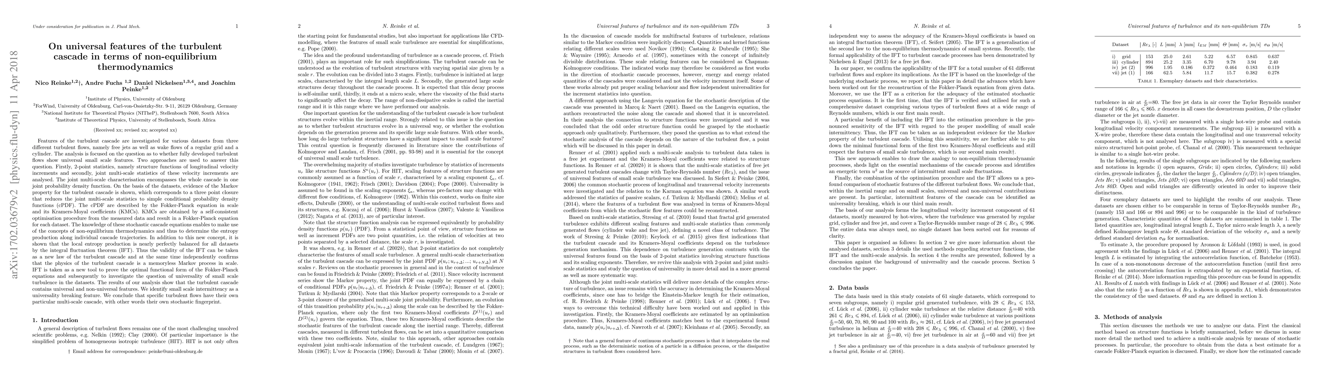 Features of the turbulent cascade are investigated for various datasets from three different turbulent flows. The analysis is focused on the question as to whether developed turbulent flows show universal small scale features. To answer this question, 2-point statistics and joint multi-scale statistics of longitudinal velocity increments are analysed. Evidence of the Markov property for the turbulent cascade is shown, which corresponds to a 3-point closure that reduces the joint multi-scale statistics to simple conditional probability density functions (cPDF). The cPDF are described by the Fokker-Planck equation in scale and its Kramers-Moyal coefficients (KMCs). KMCs are obtained by a self-consistent optimisation procedure from the measured data and result in a Fokker-Planck equation for each dataset. The knowledge of these stochastic cascade equations enables to make use of the concepts of non-equilibrium thermodynamics and thus to determine the entropy production along individual cascade trajectories. In addition to this new concept, it is shown that the local entropy production is nearly perfectly balanced for all datasets by the integral fluctuation theorem (IFT). Thus the validity of the IFT can be taken as a new law of the turbulent cascade and at the same time independently confirms that the physics of the turbulent cascade is a memoryless Markov process in scale. IFT is taken as a new tool to prove the optimal functional form of the Fokker-Planck equations and subsequently to investigate the question of universality of small scale turbulence. The results of our analysis show that the turbulent cascade contains universal and non-universal features. We identify small scale intermittency as a universality breaking feature. We conclude that specific turbulent flows have their own particular multi-scale cascade, with other words their own stochastic fingerprint.