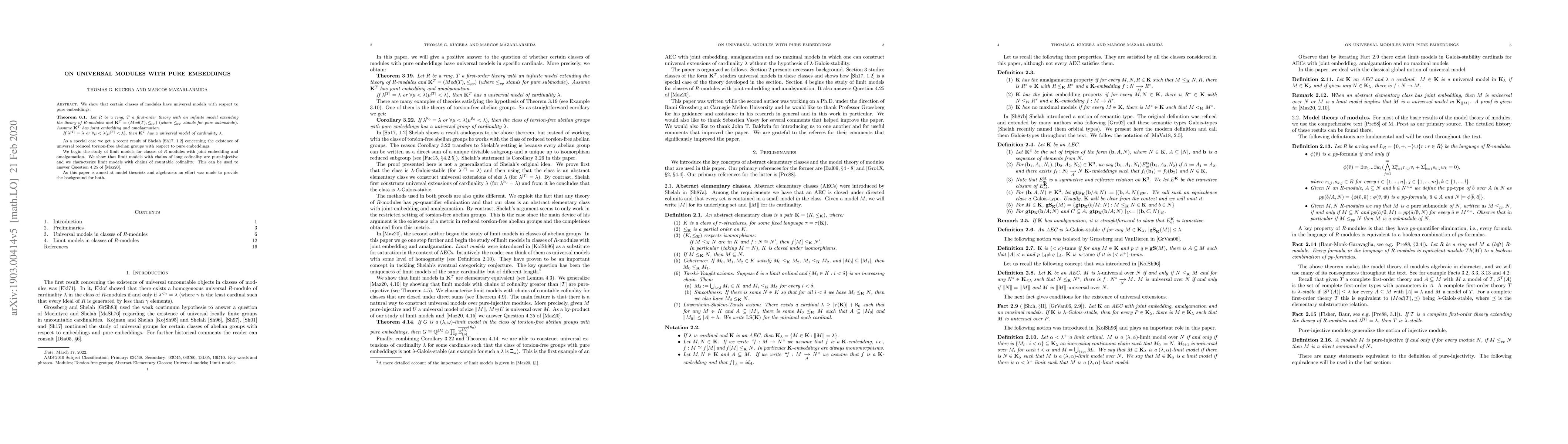 This paper shows that certain classes of modules have universal models with respect to pure embeddings, and provides conditions under which these models exist with specific cardinality properties.