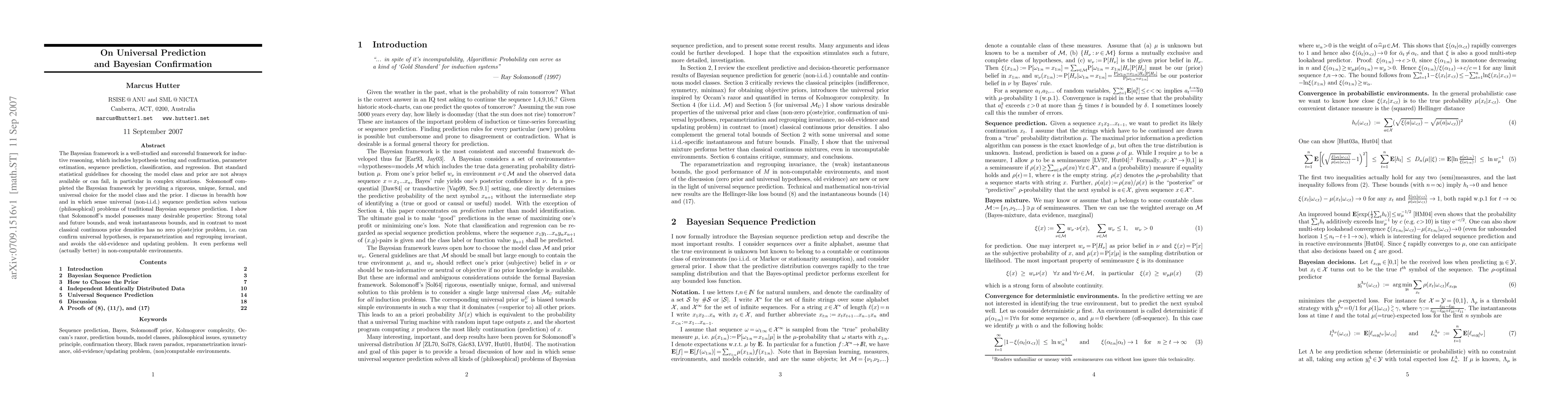 A research paper explores Solomonoff's solution to the Bayesian framework for universal prediction and confirmation, revealing its desirable properties and performance in various complex situations.