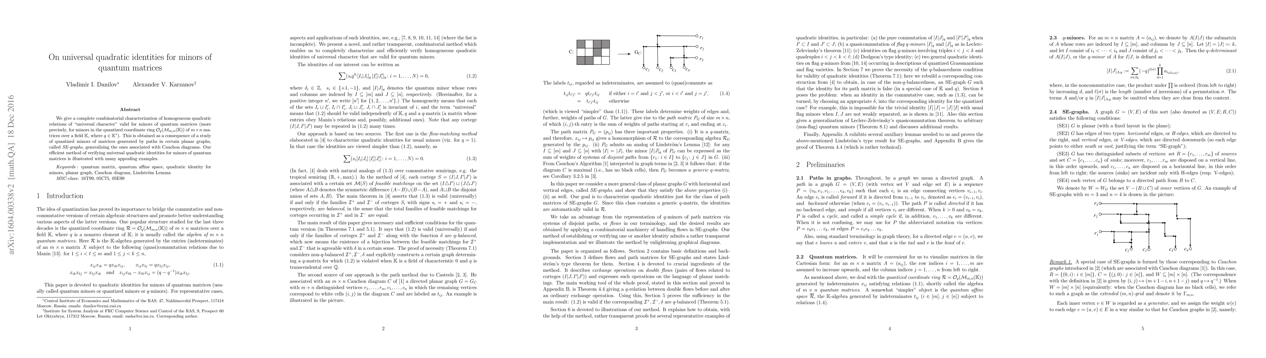 We give a complete combinatorial characterization of homogeneous quadratic relations of "universal character" valid for minors of quantum matrices (more precisely, for minors in the quantized coordinate ring $O_q(M_{m,n}(K))$ of $m\times n$ matrices over a field $K$, where $q\in K^\ast$). This is obtained as a consequence of a study of quantized minors of matrices generated by paths in certain planar graphs, called SE-graphs, generalizing the ones associated with Cauchon diagrams. Our efficient method of verifying universal quadratic identities for minors of quantum matrices is illustrated with many appealing examples.