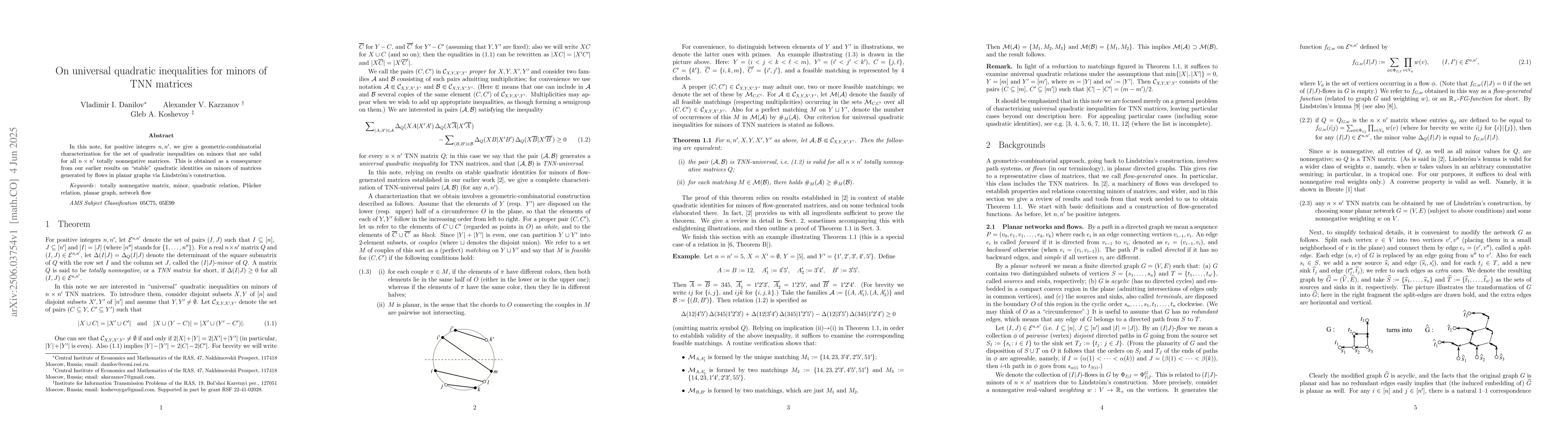 The paper presents a novel geometric-combinatorial characterization of quadratic inequalities on minors of TNN matrices, linking it to 'stable' quadratic identities via planar graph flows.