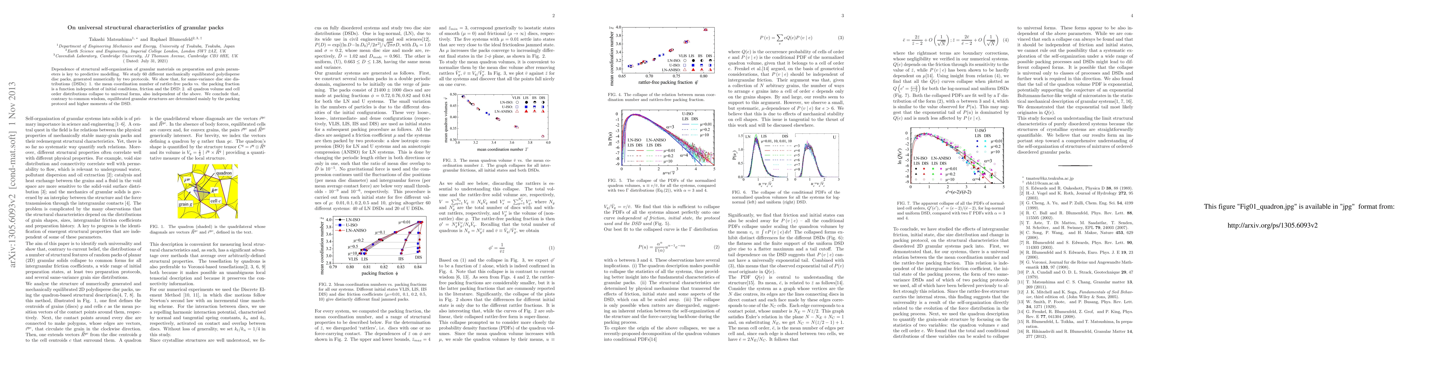 Dependence of structural self-organization of granular materials on preparation and grain parameters is key to predictive modelling. We study 60 different mechanically equilibrated polydisperse disc packs, generated numerically by two protocols. We show that, for same-variance disc size distributions (DSDs): 1. the mean coordination number of rattler-free packs vs. the packing fraction is a function independent of initial conditions, friction and the DSD: 2. all quadron volume and cell order distributions collapse to universal forms, also independent of the above. We conclude that, contrary to common wisdom, equilibrated granular structures are determined mainly by the packing protocol and higher moments of the DSD.