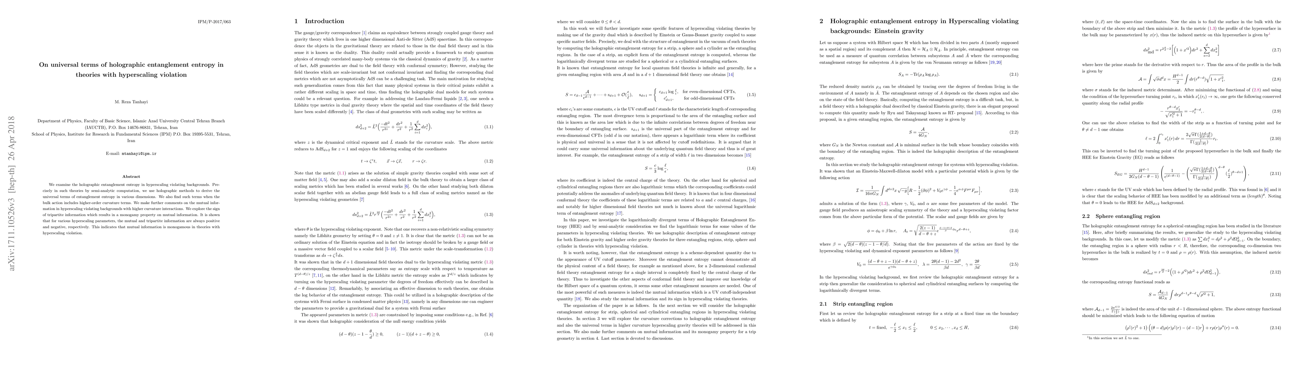 This paper investigates holographic entanglement entropy in theories with hyperscaling violation, deriving universal terms using semi-analytic holographic methods, including higher-order curvature terms. It finds mutual information is monogamous and shows tripartite information is always negative, indicating mutual information positivity for various hyperscaling parameters.