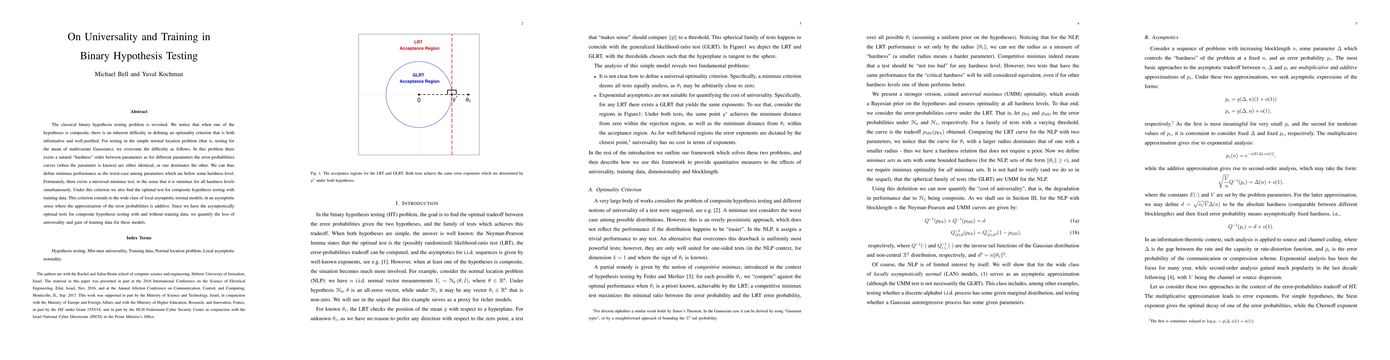The classical binary hypothesis testing problem is revisited. We notice that when one of the hypotheses is composite, there is an inherent difficulty in defining an optimality criterion that is both informative and well-justified. For testing in the simple normal location problem (that is, testing for the mean of multivariate Gaussians), we overcome the difficulty as follows. In this problem there exists a natural hardness order between parameters as for different parameters the error-probailities curves (when the parameter is known) are either identical, or one dominates the other. We can thus define minimax performance as the worst-case among parameters which are below some hardness level. Fortunately, there exists a universal minimax test, in the sense that it is minimax for all hardness levels simultaneously. Under this criterion we also find the optimal test for composite hypothesis testing with training data. This criterion extends to the wide class of local asymptotic normal models, in an asymptotic sense where the approximation of the error probabilities is additive. Since we have the asymptotically optimal tests for composite hypothesis testing with and without training data, we quantify the loss of universality and gain of training data for these models.