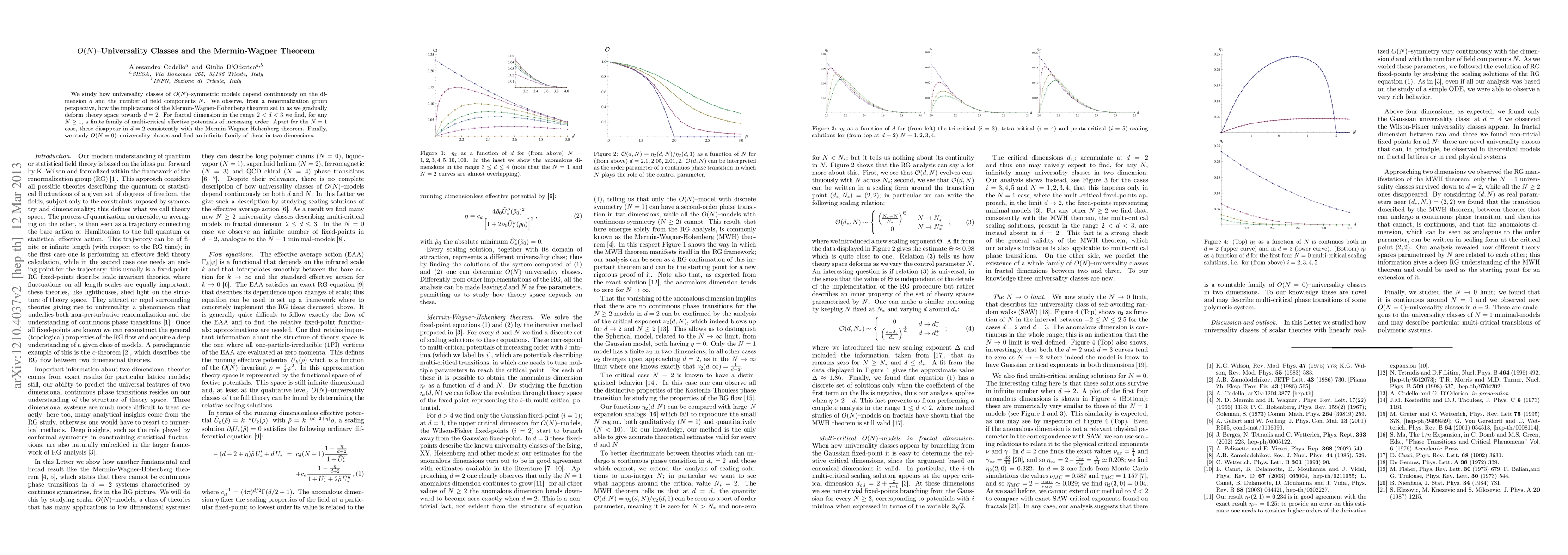 This paper investigates the behavior of O(N)-symmetric models across varying dimensions and field components, revealing a finite family of multi-critical effective potentials in dimensions 2<d<3. The study confirms the Mermin-Wagner-Hohenberg theorem's implications in two dimensions, where these potentials vanish except for N=1, and identifies an infinite family of O(N=0)-universality classes in two dimensions.
