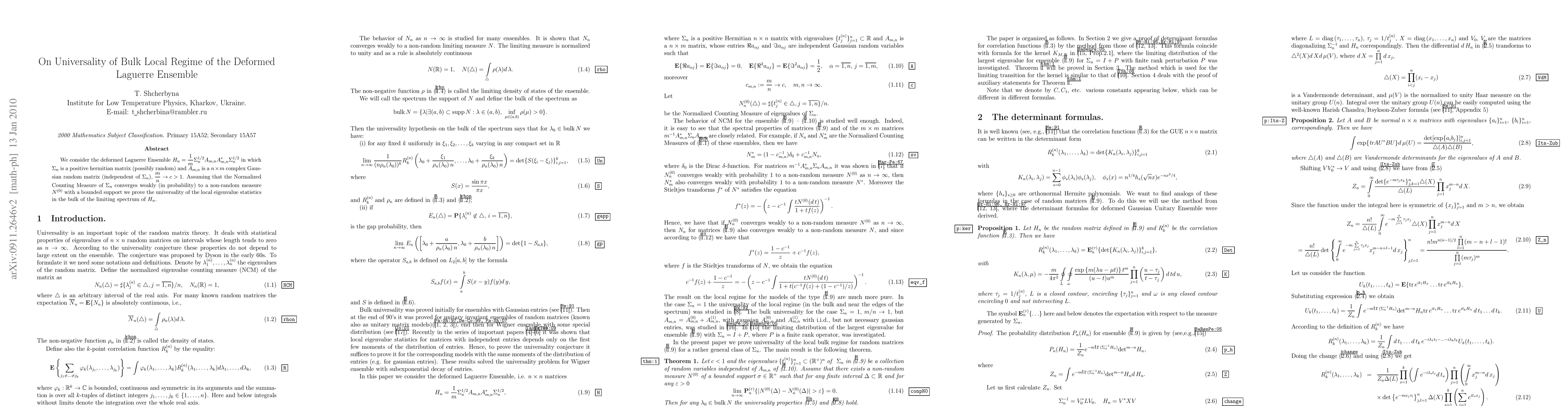 We consider the deformed Laguerre Ensemble $H_n=\dfrac{1}{m}\Sigma_n^{1/2}A_{m,n}A_{m,n}^*\Sigma_n^{1/2}$ in which $\Sigma_n$ is a positive hermitian matrix (possibly random) and $A_{m,n}$ is a $n\times m$ complex Gaussian random matrix (independent of $\Sigma_n$), $\dfrac{m}{n}\to c>1$. Assuming that the Normalized Counting Measure of $\Sigma_n$ converges weakly (in probability) to a non-random measure $N^{(0)}$ with a bounded support we prove the universality of the local eigenvalue statistics in the bulk of the limiting spectrum of $H_n$.