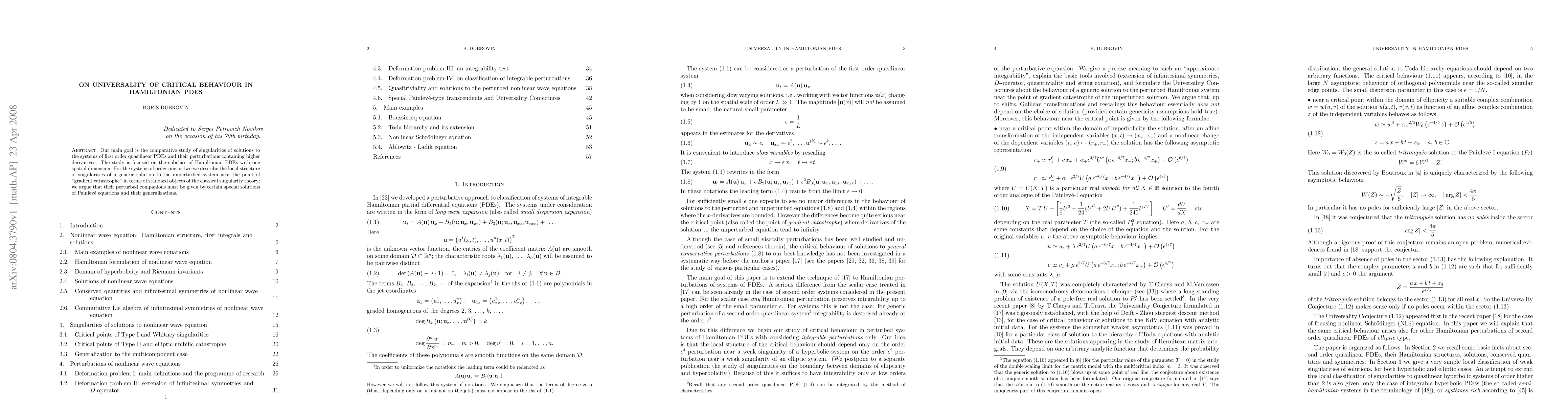Our main goal is the comparative study of singularities of solutions to the systems of first order quasilinear PDEs and their perturbations containing higher derivatives. The study is focused on the subclass of Hamiltonian PDEs with one spatial dimension. For the systems of order one or two we describe the local structure of singularities of a generic solution to the unperturbed system near the point of "gradient catastrophe" in terms of standard objects of the classical singularity theory; we argue that their perturbed companions must be given by certain special solutions of Painleve' equations and their generalizations.