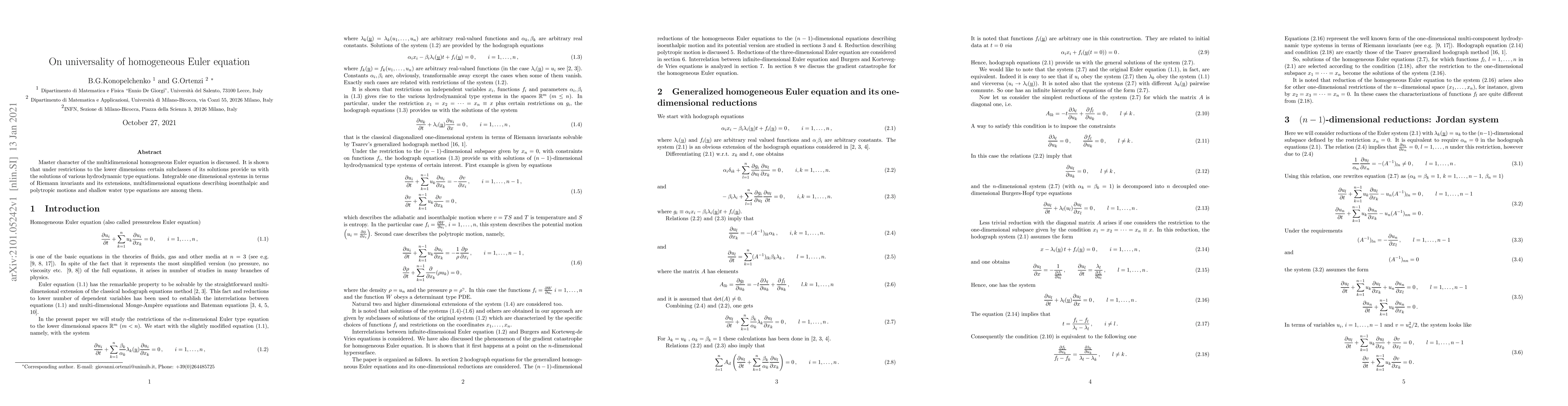 Master character of the multidimensional homogeneous Euler equation is discussed. It is shown that under restrictions to the lower dimensions certain subclasses of its solutions provide us with the solutions of various hydrodynamic type equations. Integrable one dimensional systems in terms of Riemann invariants and its extensions, multidimensional equations describing isoenthalpic and polytropic motions and shallow water type equations are among them.
