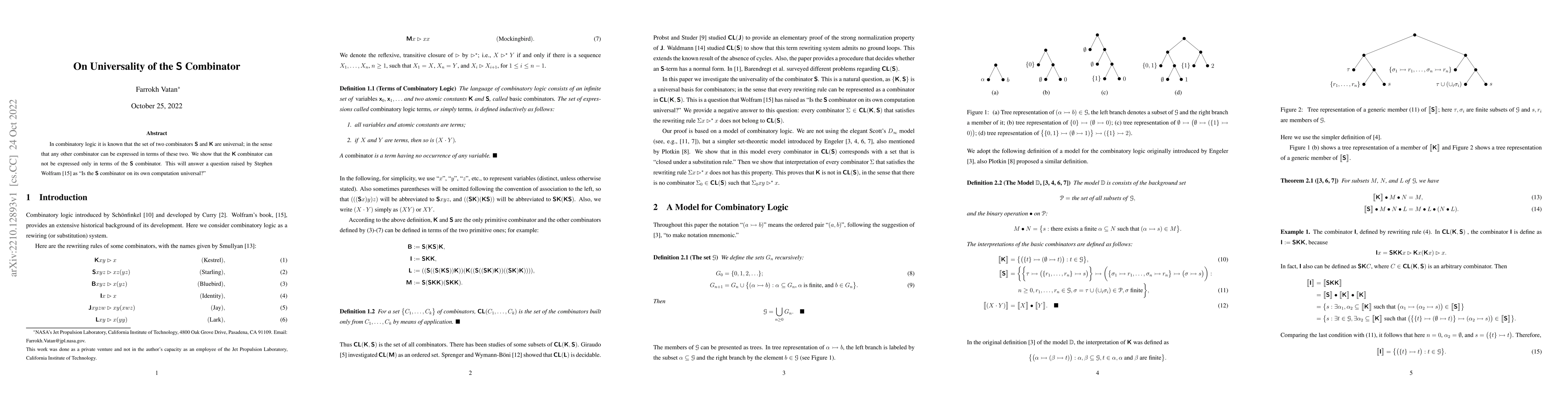 In combinatory logic it is known that the set of two combinators K and S are universal; in the sense that any other combinator can be expressed in terms of these two. K combinator can not be expressed only in terms of the S combinator. This will answer a question raised by Stephen Wolfram as ``Is the S combinator on its own computation universal?''