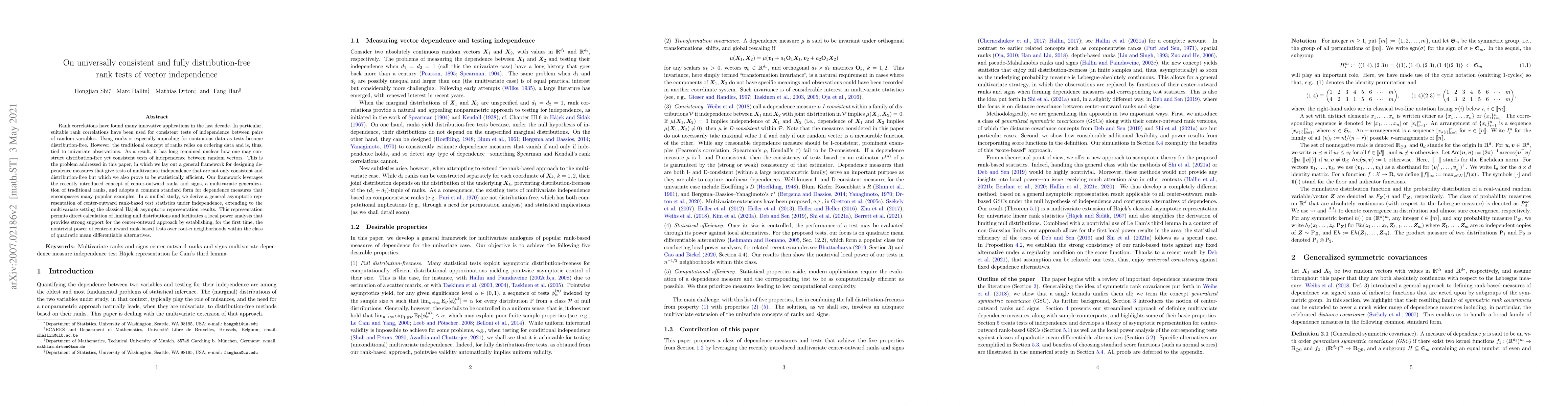 This paper develops a framework for constructing universally consistent and fully distribution-free rank tests for vector independence, leveraging the concept of center-outward ranks and signs. It provides a general asymptotic representation of these test statistics, demonstrating their efficiency and nontrivial power over certain alternatives.