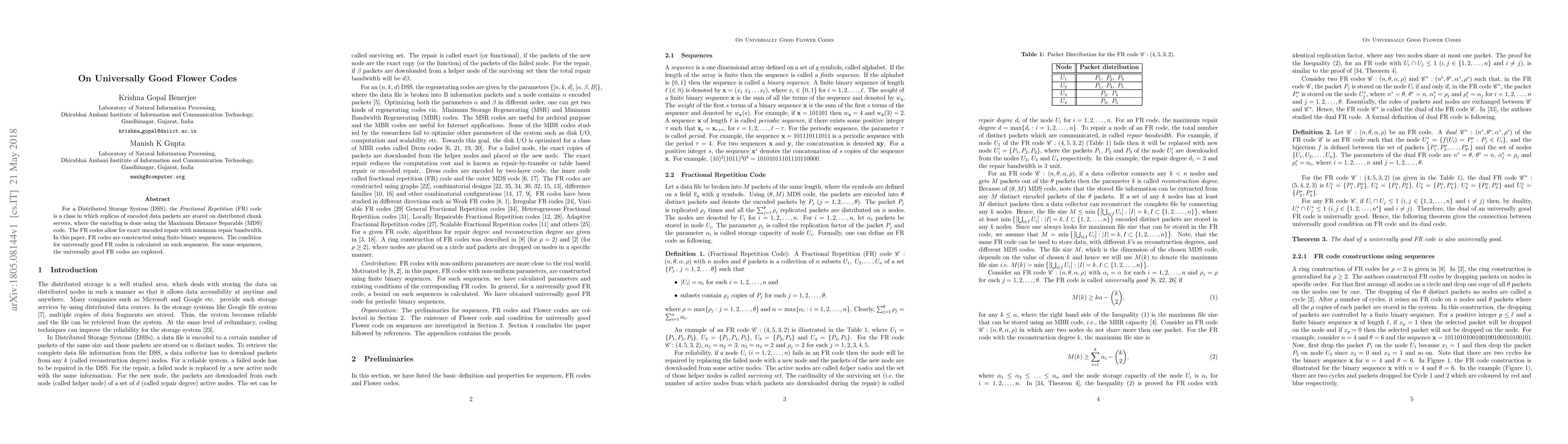 For a Distributed Storage System (DSS), the \textit{Fractional Repetition} (FR) code is a class in which replicas of encoded data packets are stored on distributed chunk servers, where the encoding is done using the Maximum Distance Separable (MDS) code. The FR codes allow for exact uncoded repair with minimum repair bandwidth. In this paper, FR codes are constructed using finite binary sequences. The condition for universally good FR codes is calculated on such sequences. For some sequences, the universally good FR codes are explored.