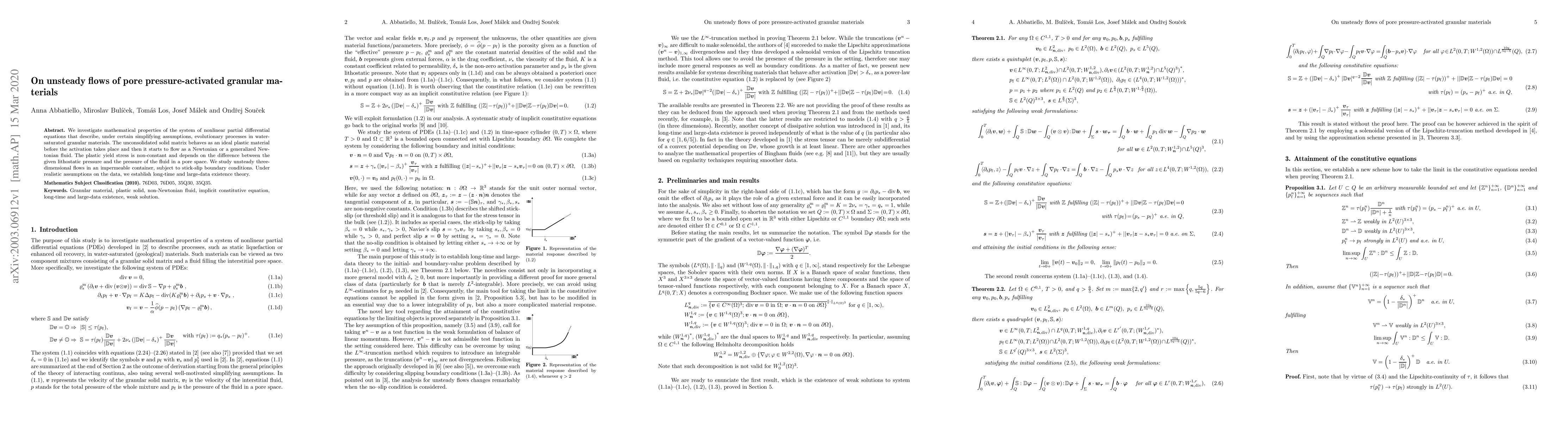 This paper explores the mathematical properties of nonlinear partial differential equations governing unsteady flows in water-saturated granular materials transitioning from plastic to fluid states. It establishes long-time and large-data existence theory for three-dimensional flows in impermeable containers under stick-slip boundary conditions.