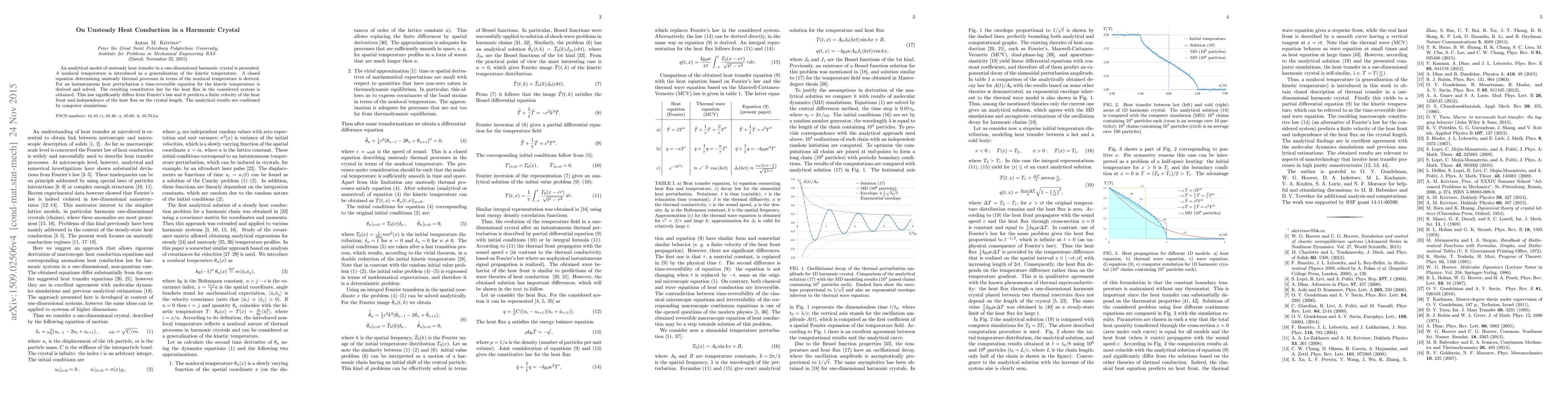 This paper presents an analytical model for unsteady heat conduction in a one-dimensional harmonic crystal, introducing a nonlocal temperature and deriving a closed equation for thermal processes. The study reveals a constitutive law for heat flux that differs from Fourier's law, predicting a finite heat front velocity and length-independent heat flux, confirmed by computer simulations.