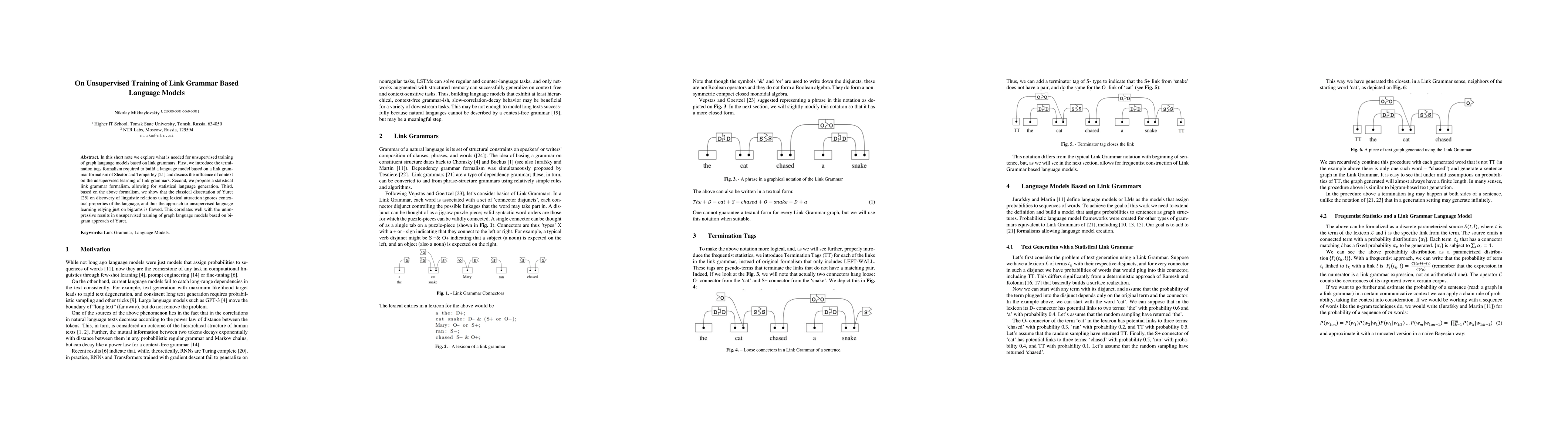 This paper investigates the requirements for unsupervised training of link grammar-based language models, introducing a termination tags formalism and proposing a statistical link grammar approach. It critiques Yuret's bigram-based method for ignoring contextual properties, leading to poor unsupervised language learning outcomes.