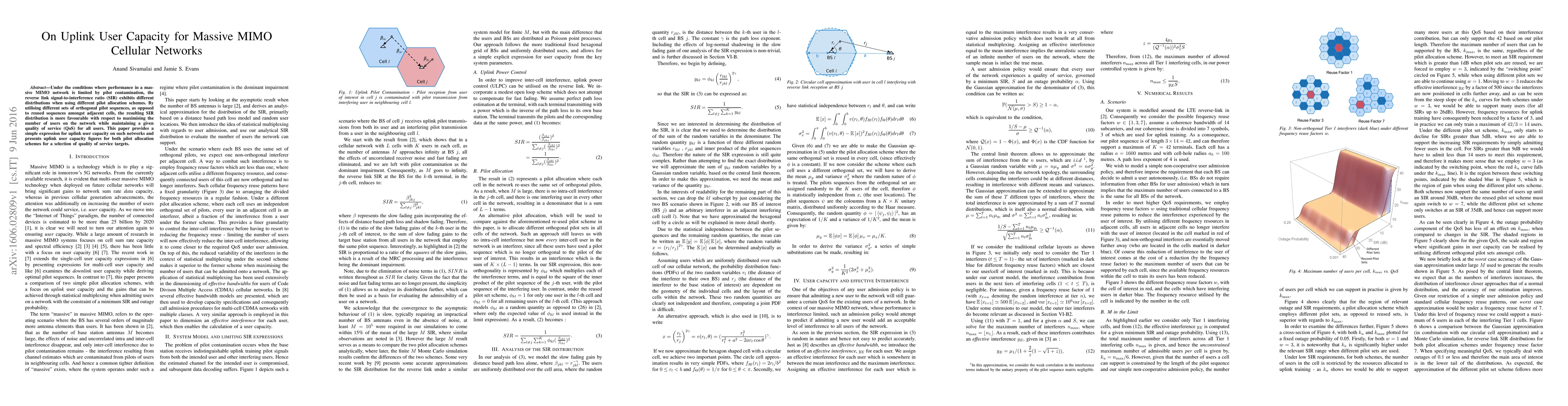 Under the conditions where performance in a massive MIMO network is limited by pilot contamination, the reverse link signal-to-interference ratio (SIR) exhibits different distributions when using different pilot allocation schemes. By utilising different sets of orthogonal pilot sequences, as opposed to reused sequences amongst adjacent cells, the resulting SIR distribution is more favourable with respect to maximising the number of users on the network while maintaining a given quality of service (QoS) for all users. This paper provides a simple expression for uplink user capacity on such networks and presents uplink user capacity figures for both pilot allocation schemes for a selection of quality of service targets.