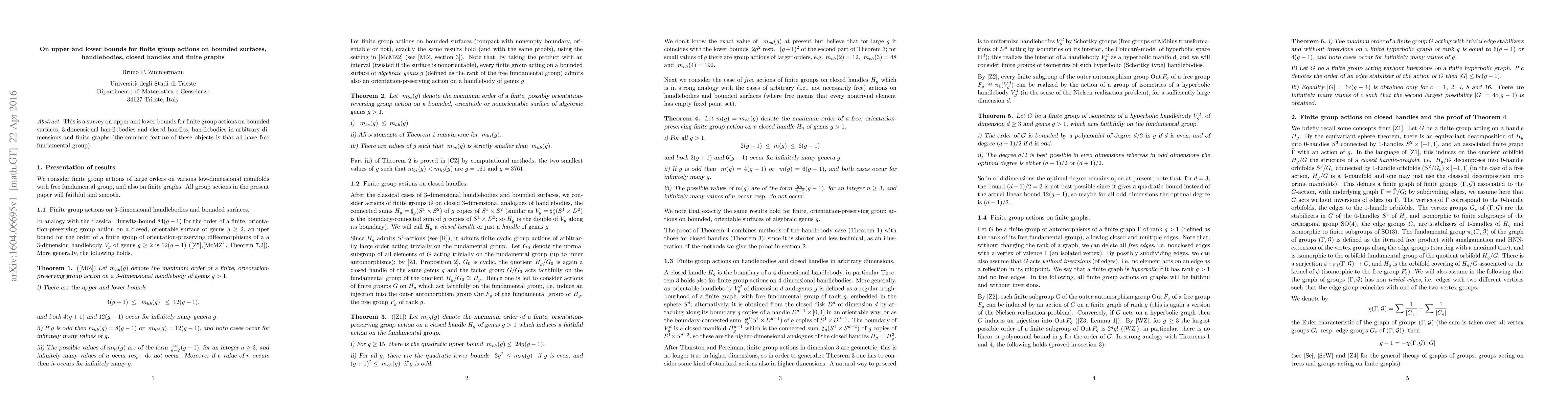 This paper surveys upper and lower bounds for finite group actions on various geometric objects, including bounded surfaces, 3-dimensional handlebodies, closed handles, higher-dimensional handlebodies, and finite graphs, all of which possess a free fundamental group.