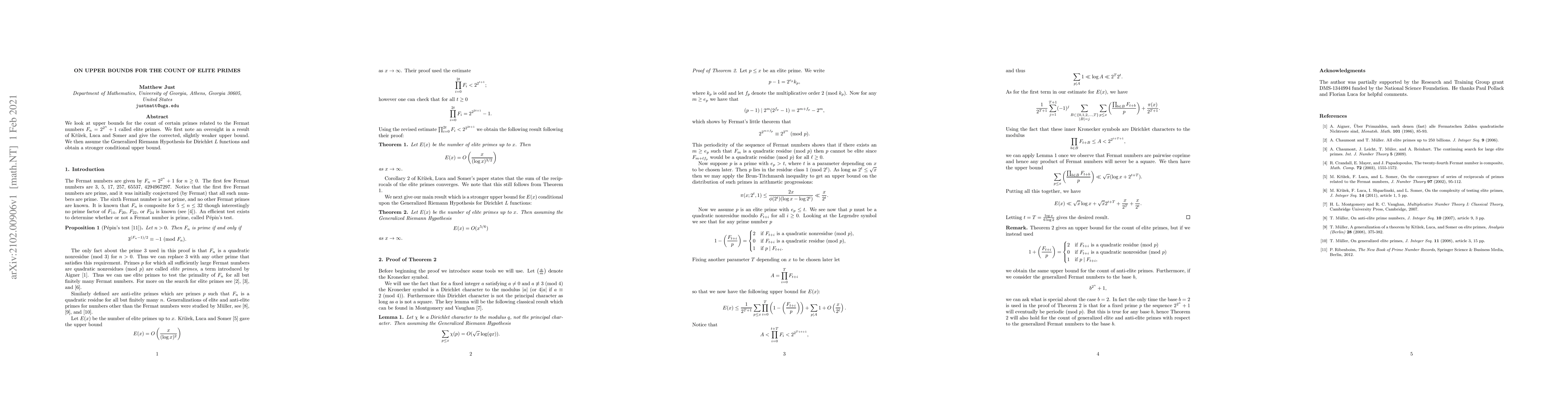 We look at upper bounds for the count of certain primes related to the Fermat numbers $F_n=2^{2^n}+1$ called elite primes. We first note an oversight in a result of Krizek, Luca and Somer and give the corrected, slightly weaker upper bound. We then assume the Generalized Riemann Hypothesis for Dirichlet L functions and obtain a stronger conditional upper bound.