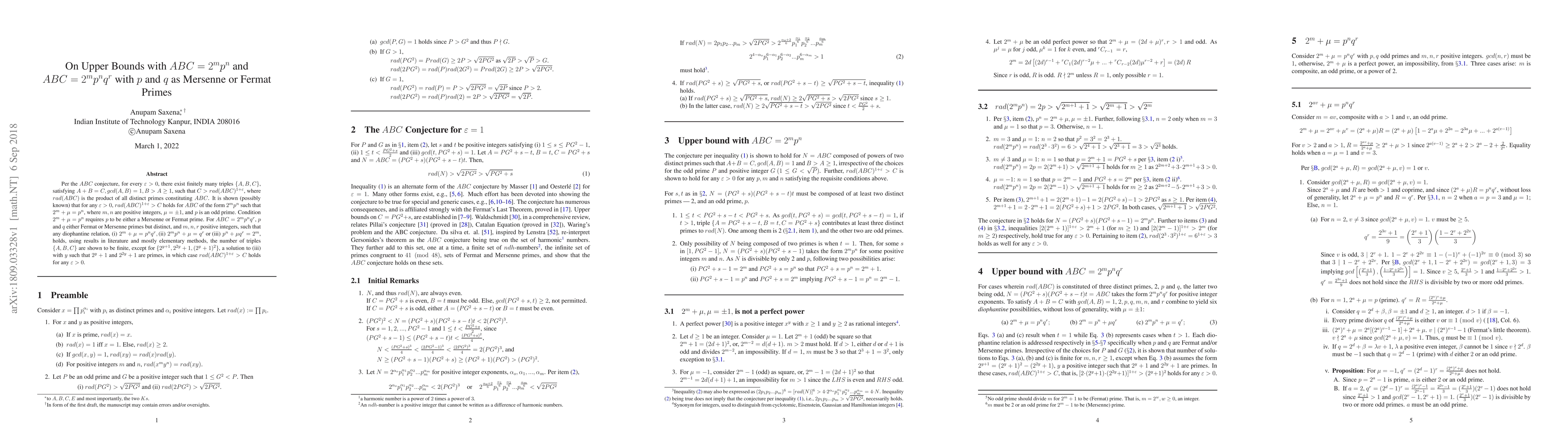 This paper explores upper bounds within the $ABC$ conjecture for triples $\{A, B, C\}$ satisfying $A + B = C$ and $gcd(A,B) = 1$. It shows that $rad(ABC)^{1 + \varepsilon} > C$ for specific forms of $ABC$ where $p$ and $q$ are Mersenne or Fermat primes, proving the number of such triples is finite, except for a particular case.