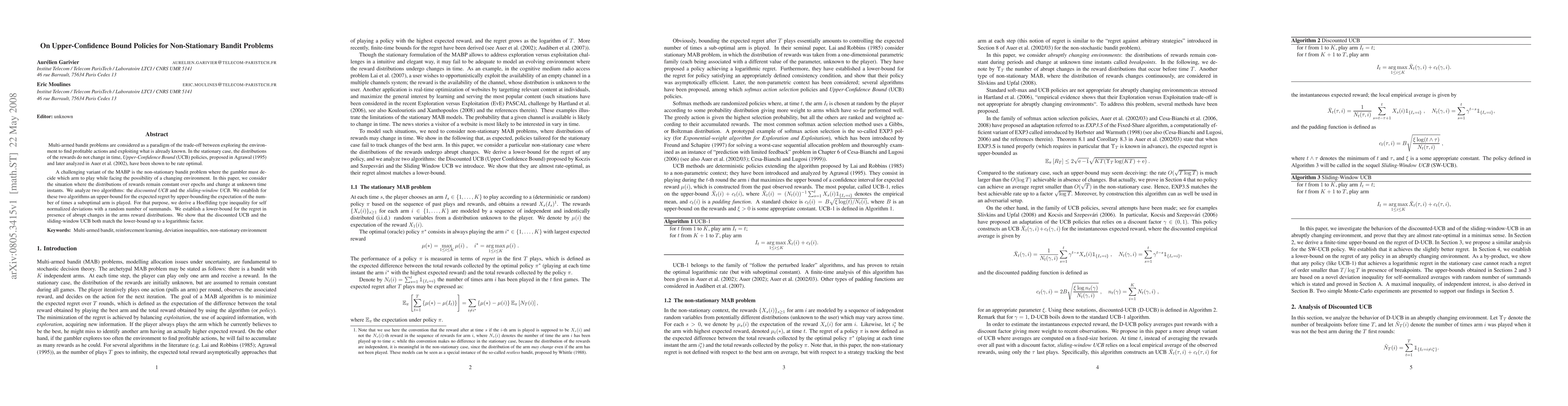 Multi-armed bandit problems are considered as a paradigm of the trade-off between exploring the environment to find profitable actions and exploiting what is already known. In the stationary case, the distributions of the rewards do not change in time, Upper-Confidence Bound (UCB) policies have been shown to be rate optimal. A challenging variant of the MABP is the non-stationary bandit problem where the gambler must decide which arm to play while facing the possibility of a changing environment. In this paper, we consider the situation where the distributions of rewards remain constant over epochs and change at unknown time instants. We analyze two algorithms: the discounted UCB and the sliding-window UCB. We establish for these two algorithms an upper-bound for the expected regret by upper-bounding the expectation of the number of times a suboptimal arm is played. For that purpose, we derive a Hoeffding type inequality for self normalized deviations with a random number of summands. We establish a lower-bound for the regret in presence of abrupt changes in the arms reward distributions. We show that the discounted UCB and the sliding-window UCB both match the lower-bound up to a logarithmic factor.