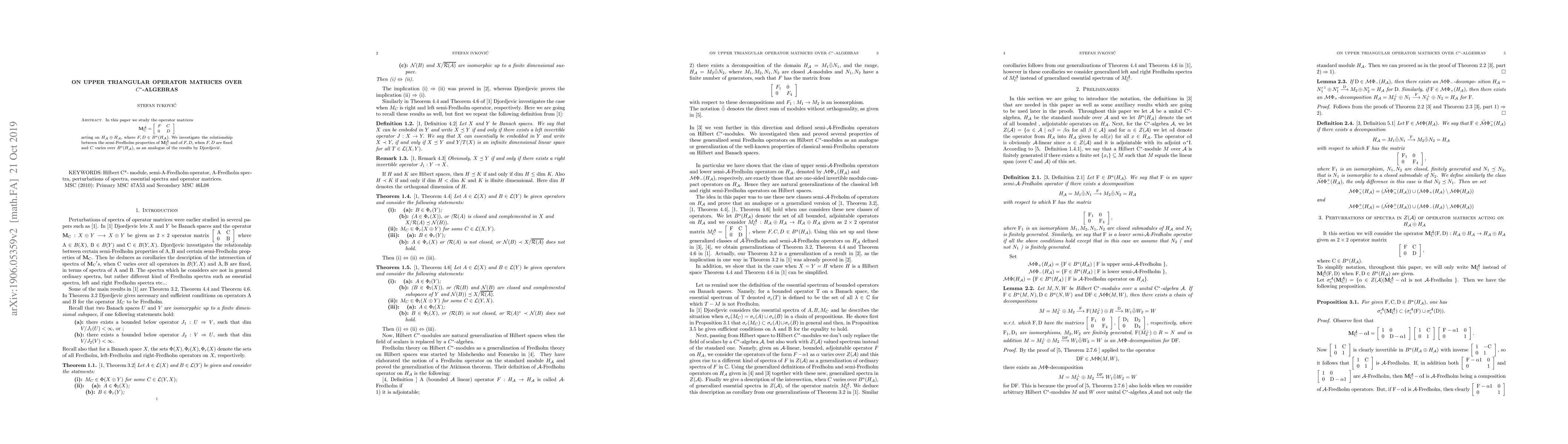 This paper examines adjointable, bounded operators represented by upper triangular 2x2 operator matrices over C*-modules, establishing conditions relating their semi-A-Fredholm properties to those of their diagonal entries. It also generalizes the concept of operator spectra using the center of the C*-algebra, proving a generalized relationship between spectra of these matrices and their diagonals.
