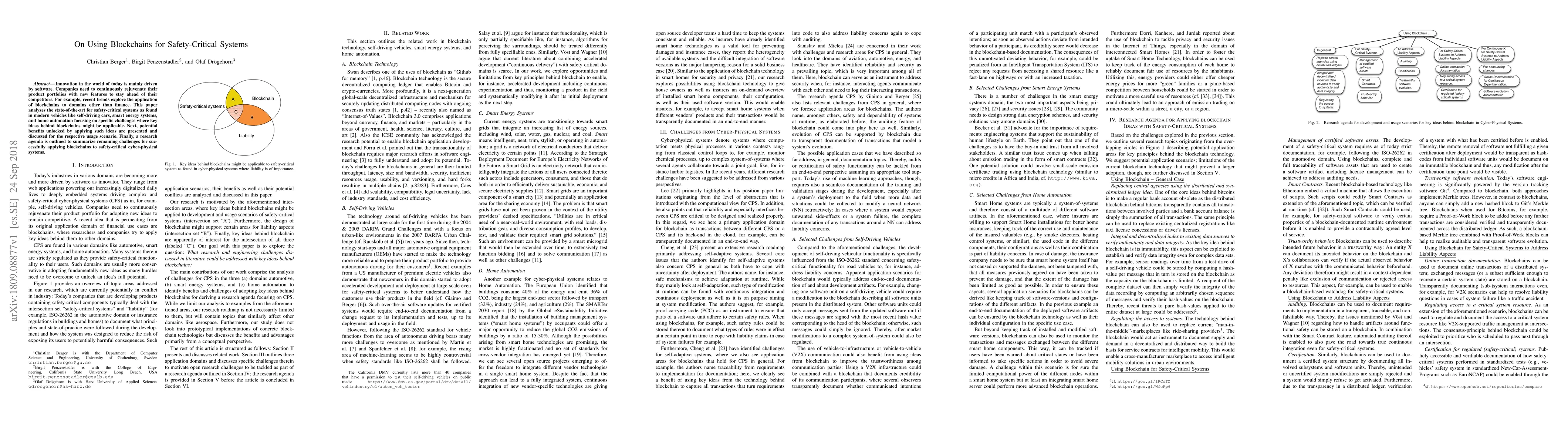 Innovation in the world of today is mainly driven by software. Companies need to continuously rejuvenate their product portfolios with new features to stay ahead of their competitors. For example, recent trends explore the application of blockchains to domains other than finance. This paper analyzes the state-of-the-art for safety-critical systems as found in modern vehicles like self-driving cars, smart energy systems, and home automation focusing on specific challenges where key ideas behind blockchains might be applicable. Next, potential benefits unlocked by applying such ideas are presented and discussed for the respective usage scenario. Finally, a research agenda is outlined to summarize remaining challenges for successfully applying blockchains to safety-critical cyber-physical systems.