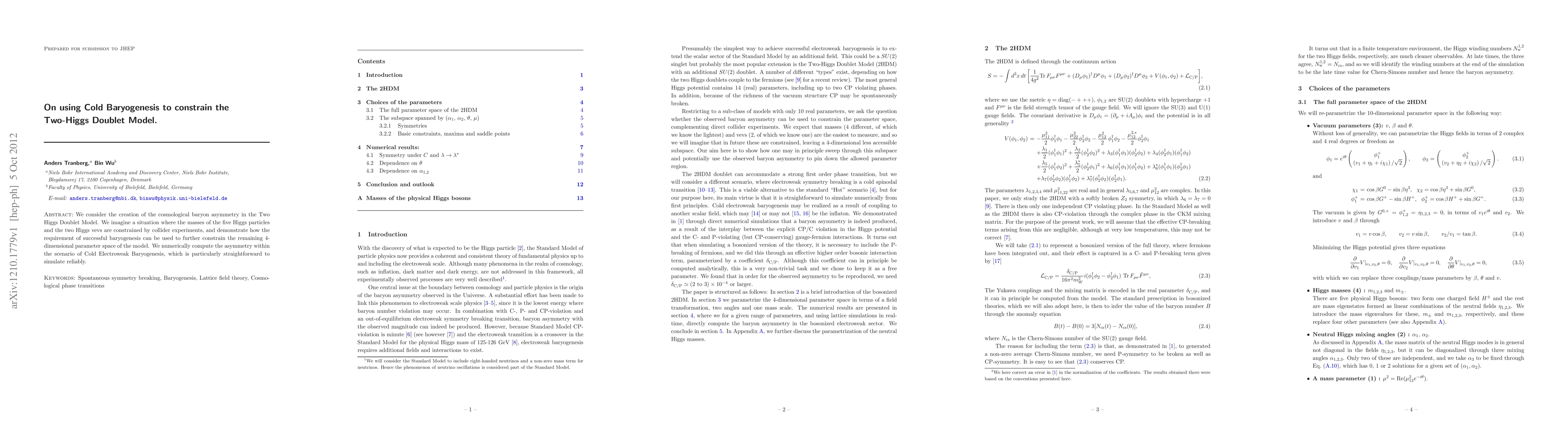 This paper explores the Two-Higgs Doublet Model's potential for generating cosmological baryon asymmetry through Cold Electroweak Baryogenesis. It uses collider constraints to further limit the model's parameter space and numerically computes the resulting asymmetry.