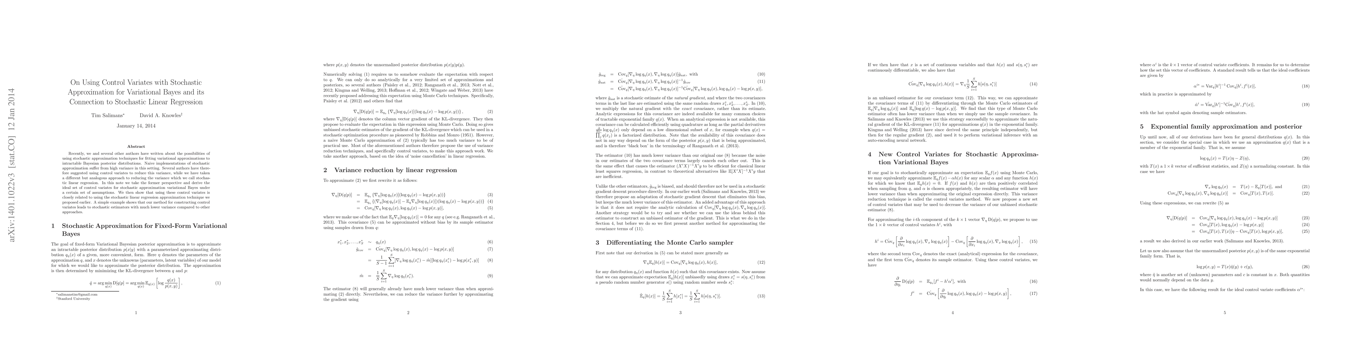 This paper explores the use of control variates to reduce variance in stochastic approximation for variational Bayes, deriving an ideal set of control variates and demonstrating their connection to stochastic linear regression, which shows significantly lower variance in stochastic estimators.