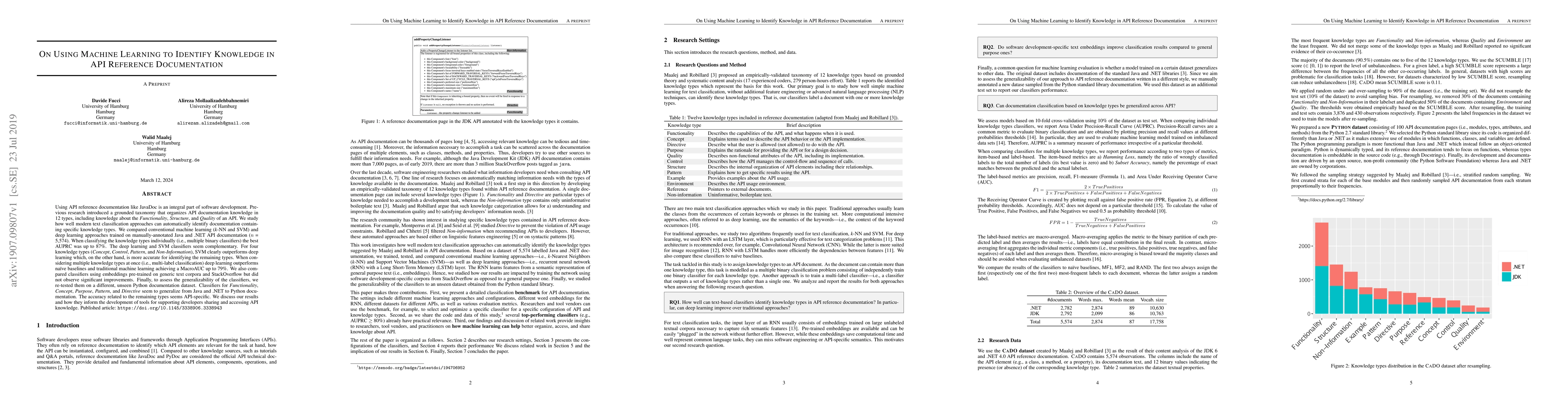Using API reference documentation like JavaDoc is an integral part of software development. Previous research introduced a grounded taxonomy that organizes API documentation knowledge in 12 types, including knowledge about the Functionality, Structure, and Quality of an API. We study how well modern text classification approaches can automatically identify documentation containing specific knowledge types. We compared conventional machine learning (k-NN and SVM) and deep learning approaches trained on manually annotated Java and .NET API documentation (n = 5,574). When classifying the knowledge types individually (i.e., multiple binary classifiers) the best AUPRC was up to 87%. The deep learning and SVM classifiers seem complementary. For four knowledge types (Concept, Control, Pattern, and Non-Information), SVM clearly outperforms deep learning which, on the other hand, is more accurate for identifying the remaining types. When considering multiple knowledge types at once (i.e., multi-label classification) deep learning outperforms na\"ive baselines and traditional machine learning achieving a MacroAUC up to 79%. We also compared classifiers using embeddings pre-trained on generic text corpora and StackOverflow but did not observe significant improvements. Finally, to assess the generalizability of the classifiers, we re-tested them on a different, unseen Python documentation dataset. Classifiers for Functionality, Concept, Purpose, Pattern, and Directive seem to generalize from Java and .NET to Python documentation. The accuracy related to the remaining types seems API-specific. We discuss our results and how they inform the development of tools for supporting developers sharing and accessing API knowledge. Published article: https://doi.org/10.1145/3338906.3338943