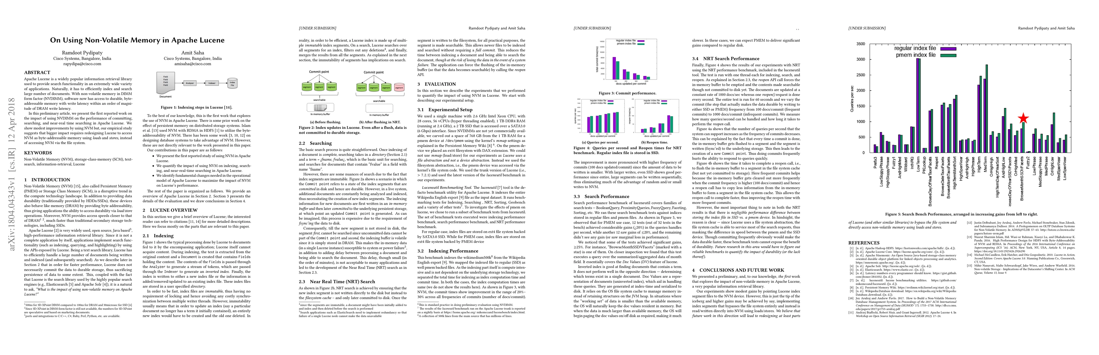 This paper explores the impact of using non-volatile memory (NVDIMM) in Apache Lucene to improve performance for committing, searching, and near-real-time search operations. While modest improvements were observed, the study suggests significant gains could be achieved by redesigning Lucene to directly access NVDIMM as byte-addressable memory.
