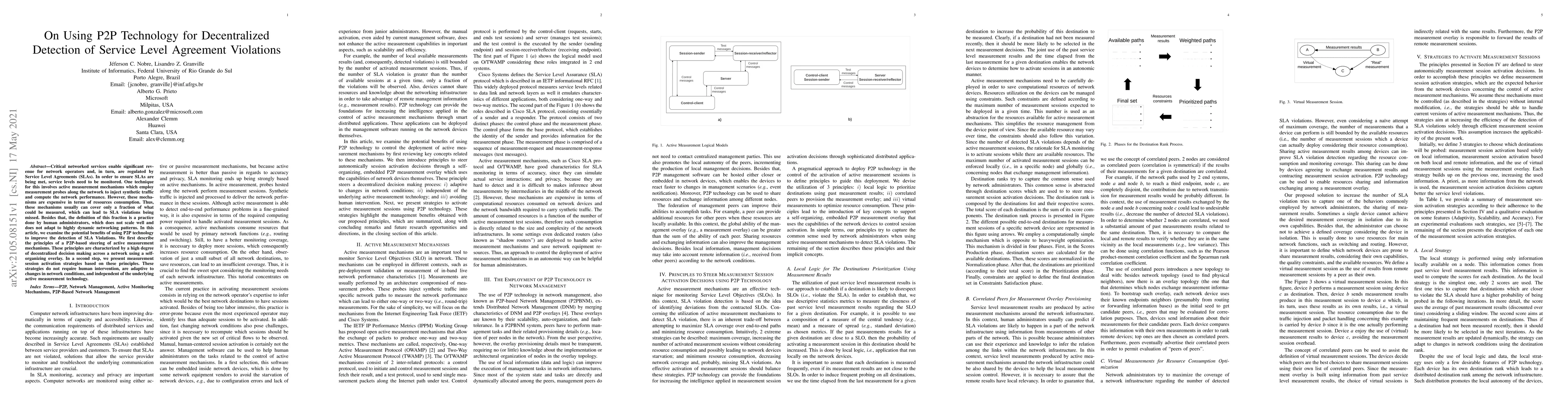 Critical networked services enable significant revenue for network operators and, in turn, are regulated by Service Level Agreements (SLAs). In order to ensure SLAs are being met, service levels need to be monitored. One technique for this involves active measurement mechanisms which employ measurement probes along the network to inject synthetic traffic and compute the network performance. However, these mechanisms are expensive in terms of resources consumption. Thus, these mechanisms usually can cover only a fraction of what could be measured, which can lead to SLA violations being missed. Besides that, the definition of this fraction is a practice done by human administrators, which does not scale well and does not adapt to highly dynamic networking patterns. In this article, we examine the potential benefits of using P2P technology to improve the detection of SLA Violations. We first describe the principles of a P2P-based steering of active measurement mechanisms. These principles are characterized by a high degree of decentralized decision making across a network using a self-organizing overlay. In a second step, we present measurement session activation strategies based on these principles. These strategies do not require human intervention, are adaptive to changes in network conditions, and independent of the underlying active measurement technology.