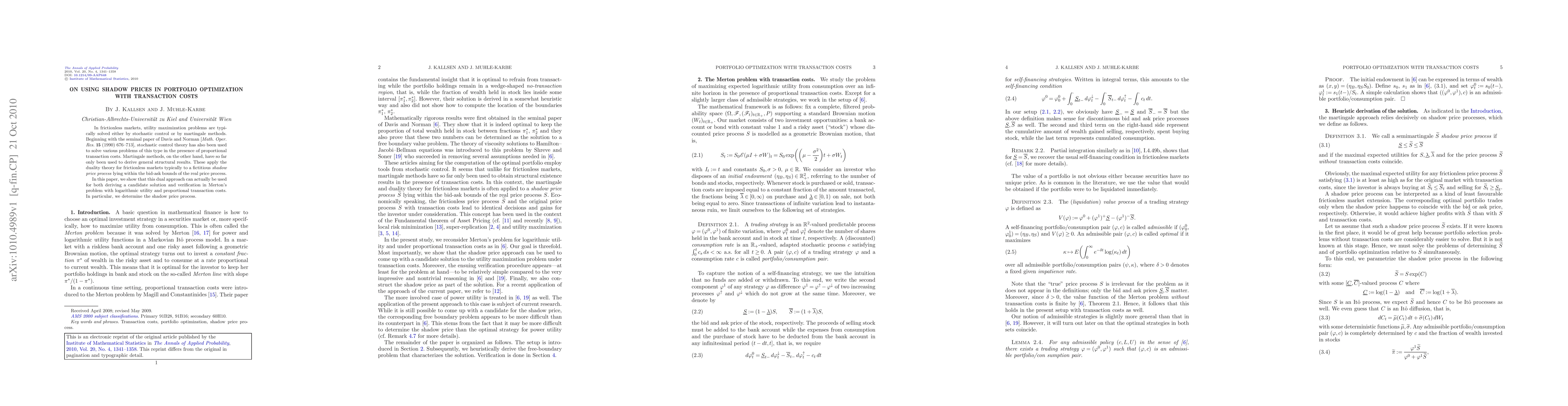 This paper demonstrates that dual approaches, particularly martingale methods, can be effectively utilized to derive and verify solutions in portfolio optimization problems with transaction costs, extending beyond traditional stochastic control methods. The authors determine the shadow price process as part of solving Merton's problem with logarithmic utility under proportional transaction costs.
