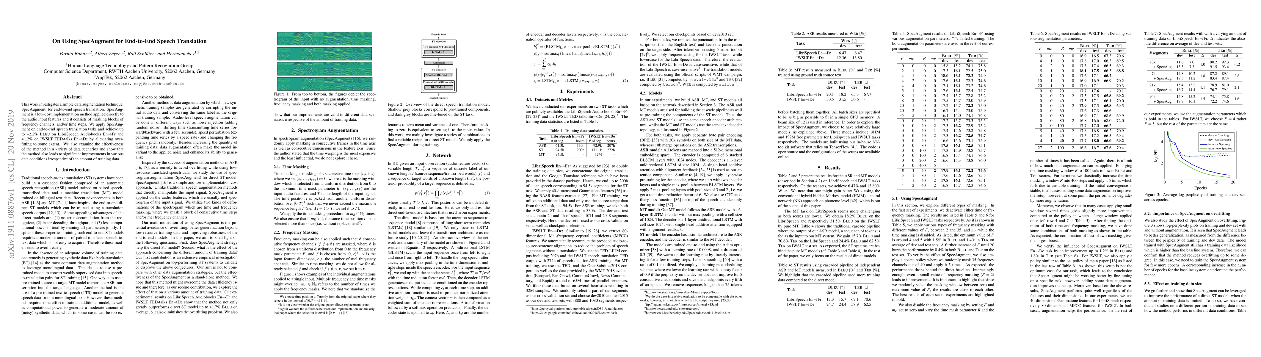 This paper explores the use of SpecAugment, a data augmentation technique that masks frequency and time blocks, to enhance end-to-end speech translation models, achieving up to +2.2% BLEU score improvement on LibriSpeech and +1.2% on IWSLT, indicating its effectiveness across different data scenarios.