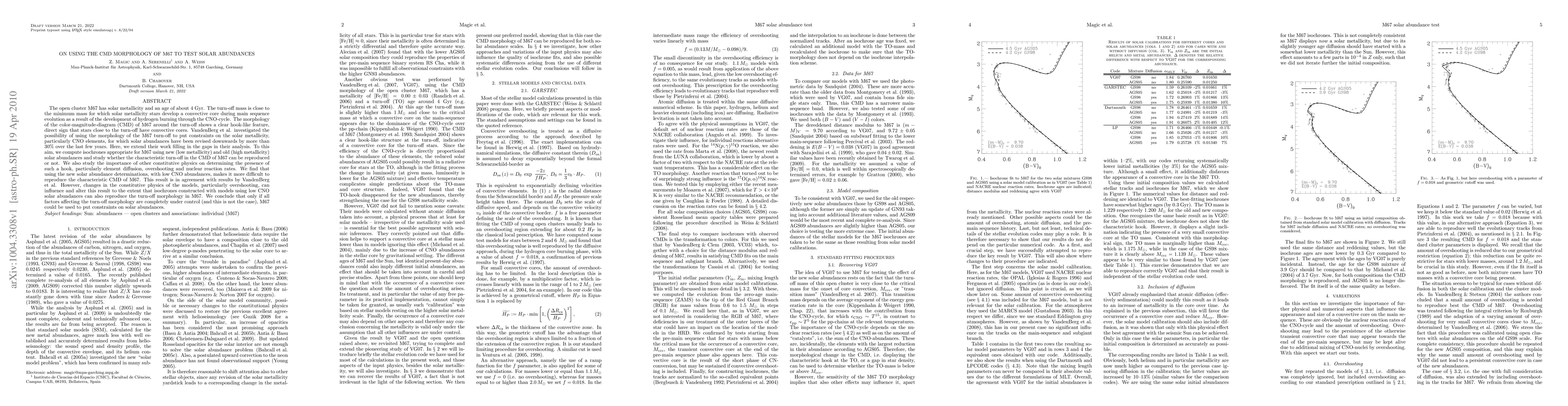 This paper investigates the morphology of the M67 color-magnitude diagram (CMD) to test solar metallicity, particularly CNO elements, finding that low CNO abundances make it difficult to reproduce the observed M67 turn-off feature. However, changes in model physics, especially overshooting, can alter this result, suggesting M67 cannot conclusively constrain solar abundances without fully controlled factors.