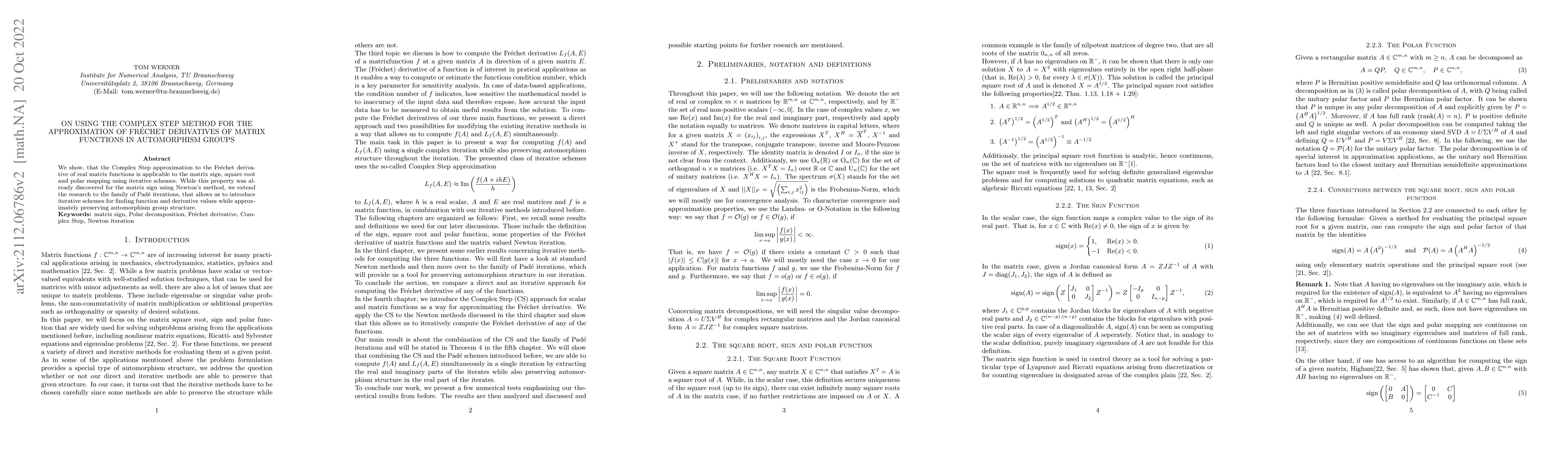 This paper demonstrates the application of the Complex Step method for approximating Fr\'echet derivatives of real matrix functions, including the matrix sign, square root, and polar mapping. It extends the method to Pad\'e iterations, enabling iterative schemes that preserve the automorphism group structure.