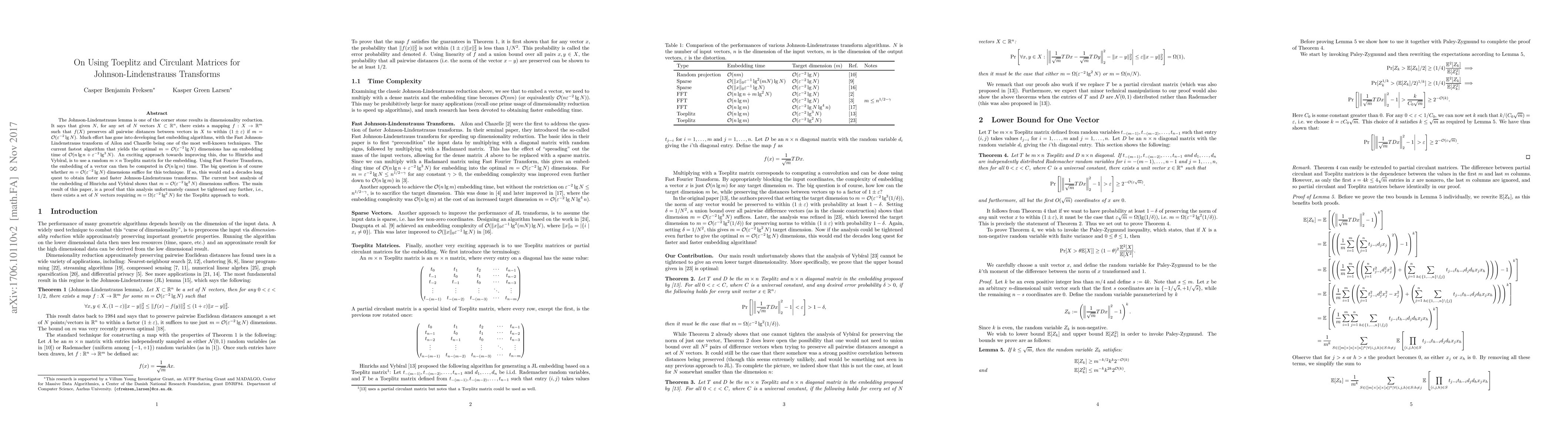 This paper investigates the use of Toeplitz matrices for Johnson-Lindenstrauss transforms, demonstrating that while Toeplitz matrices can speed up embedding computation, they require $m = \Omega(\varepsilon^{-2} \lg^2 N)$ dimensions to maintain distance preservation, thus not improving upon existing optimal dimension bounds.