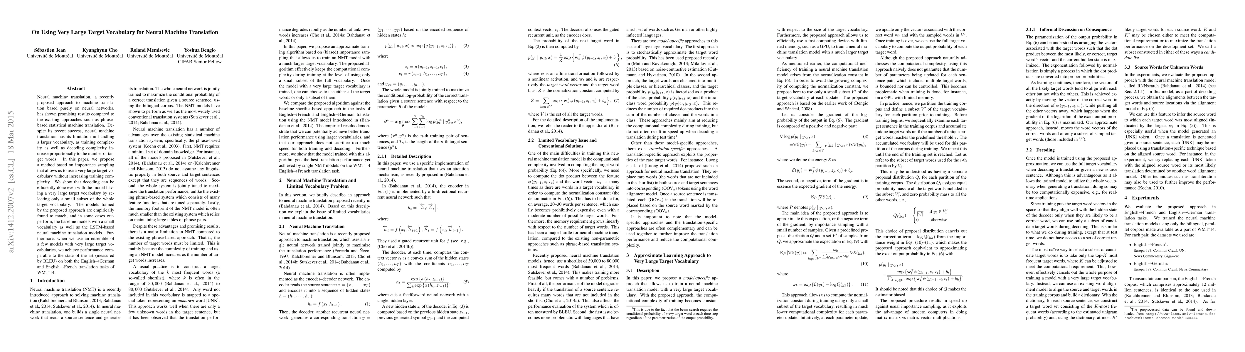 This paper proposes a method to efficiently use a very large target vocabulary in neural machine translation by employing importance sampling and decoding with a small subset of the vocabulary, achieving state-of-the-art performance on English->German translation and near-optimal results on English->French translation.
