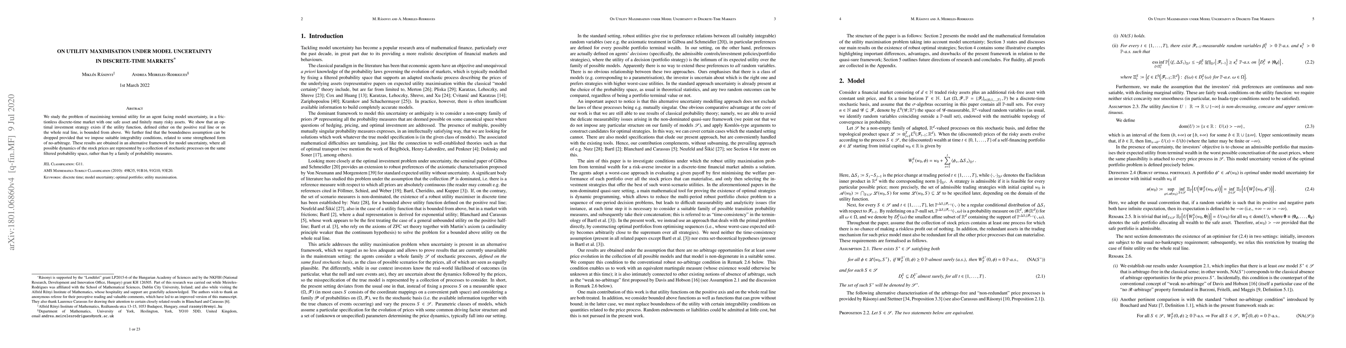 This paper investigates optimal investment strategies for maximizing terminal utility under model uncertainty in a discrete-time market. It demonstrates that bounded utility functions ensure the existence of optimal strategies, and relaxes this condition under strengthened no-arbitrage integrability.