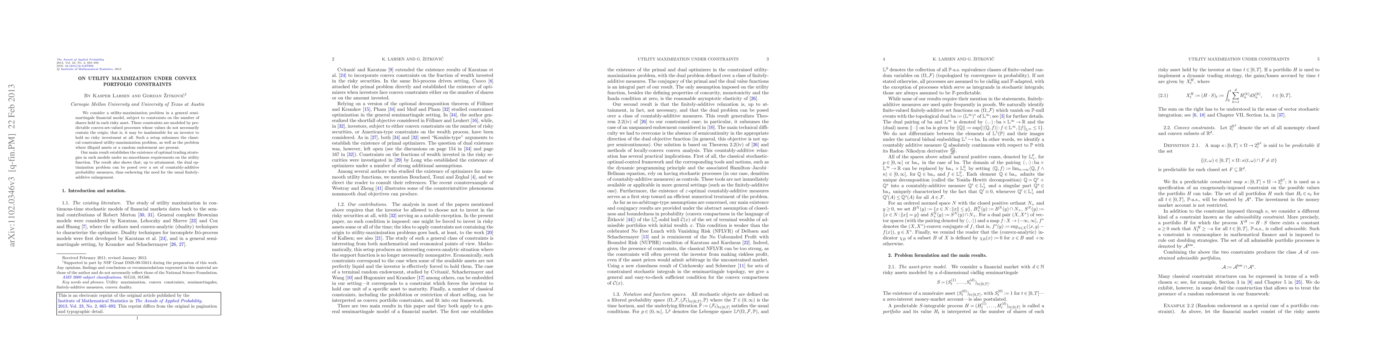 This paper addresses utility maximization in a semimartingale financial model with convex portfolio constraints, including scenarios with illiquid assets or random endowments. The authors prove the existence of optimal trading strategies without requiring smoothness of the utility function, and the dual optimization problem can be formulated using countably-additive probability measures.