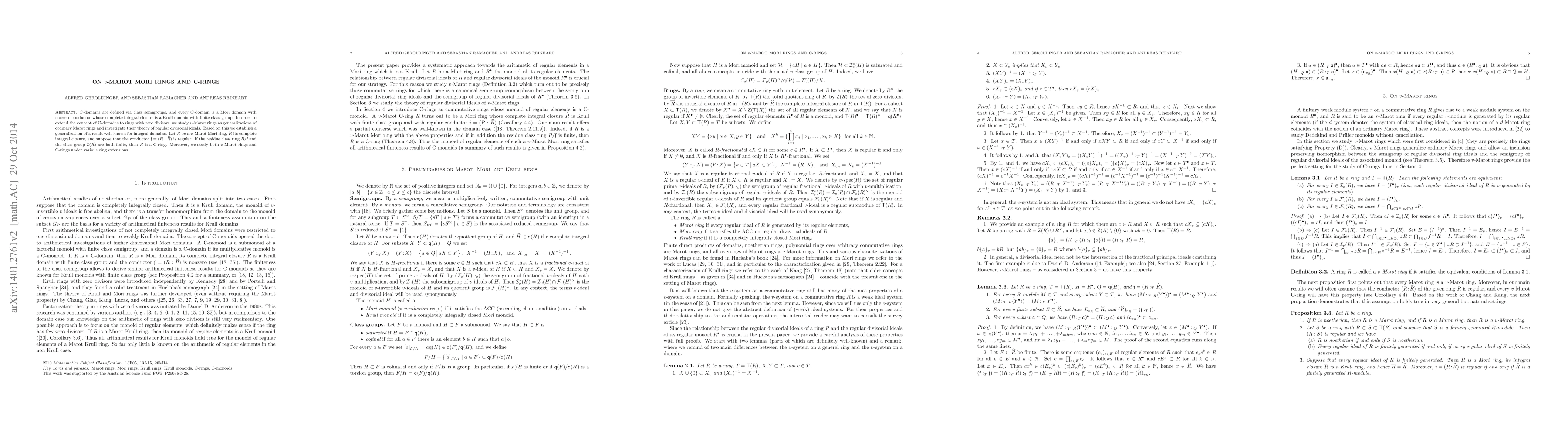 C-domains are defined via class semigroups, and every C-domain is a Mori domain with nonzero conductor whose complete integral closure is a Krull domain with finite class group. In order to extend the concept of C-domains to rings with zero divisors, we introduce $v$-Marot rings as generalizations of ordinary Marot rings and study their theory of regular divisorial ideals. Based on this we establish a generalization of a result well-known for integral domains. Let $R$ be a $v$-Marot Mori ring, $\hat R$ its complete integral closure, and suppose that the conductor $\mathfrak f = (R : \hat R)$ is regular. If the residue class ring $R/\mathfrak f$ and the class group $\mathcal C (\hat R)$ are both finite, then $R$ is a C-ring. Moreover, we study both $v$-Marot rings and C-rings under various ring extensions.