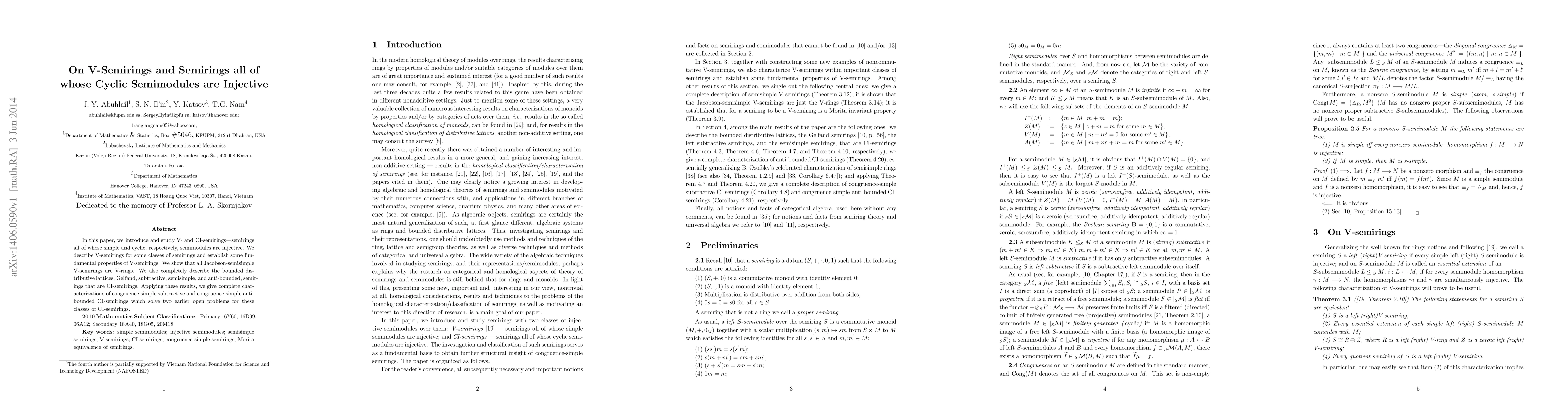 This paper investigates V-semirings and CI-semirings, focusing on semirings where all simple and cyclic semimodules are injective. It establishes fundamental properties, shows that Jacobson-semisimple V-semirings are V-rings, and provides complete characterizations of certain classes of CI-semirings, solving two previously open problems in the field.