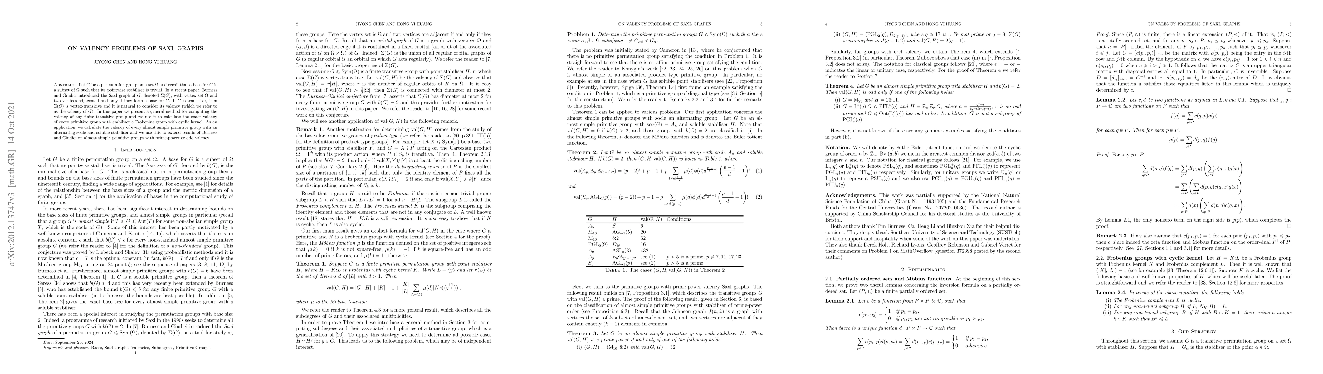 Let $G$ be a permutation group on a set $\Omega$ and recall that a base for $G$ is a subset of $\Omega$ such that its pointwise stabiliser is trivial. In a recent paper, Burness and Giudici introduced the Saxl graph of $G$, denoted $\Sigma(G)$, with vertex set $\Omega$ and two vertices adjacent if they form a base. If $G$ is transitive, then $\Sigma(G)$ is vertex-transitive and it is natural to consider its valency (which we refer to as the valency of $G$). In this paper we present a general method for computing the valency of any finite transitive group and we use it to calculate the exact valency of every primitive group with stabiliser a Frobenius group with cyclic kernel. As an application, we calculate the valency of every almost simple primitive group with an alternating socle and soluble stabiliser and we use this to extend results of Burness and Giudici on almost simple primitive groups with prime-power or odd valency.